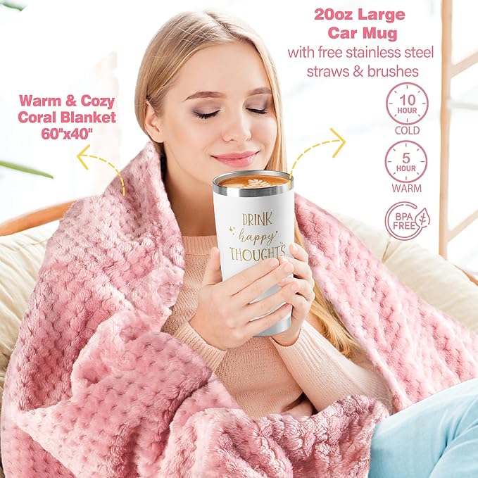 - 12-PIECE SELF-CARE GIFT SET: The LA NOVO Spa Gifts Box for Women includes 12 carefully selected self-care items. This stylish gift box features: A luxurious coral flannel blanket, 20oz insulated tumbler with stainless steel straws, lavender-scented candle, Handmade soap, bath bomb, silk eye mask, silk headband, and scrunchie, Fuzzy socks, greeting card, An elegant gift box. Send this thoughtful spa gift box to help her relax and enjoy a cozy, pampered moment.
