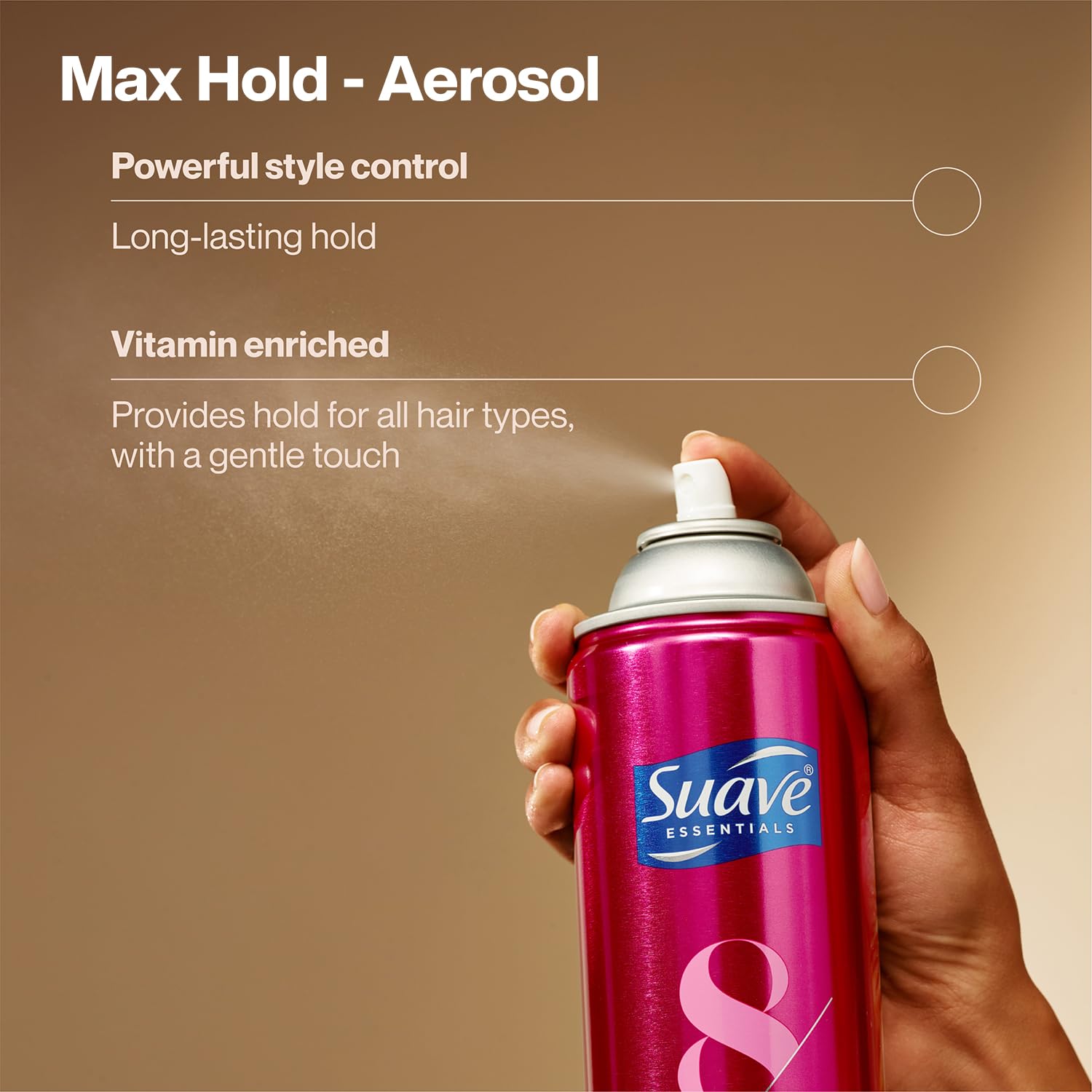 - HAIR STYLING PRODUCTS: Stay prepared for any occasion with the Suave Max Hold Hairspray bundle, which includes one unscented hairspray can and one scented non-aerosol hairspray bottle.