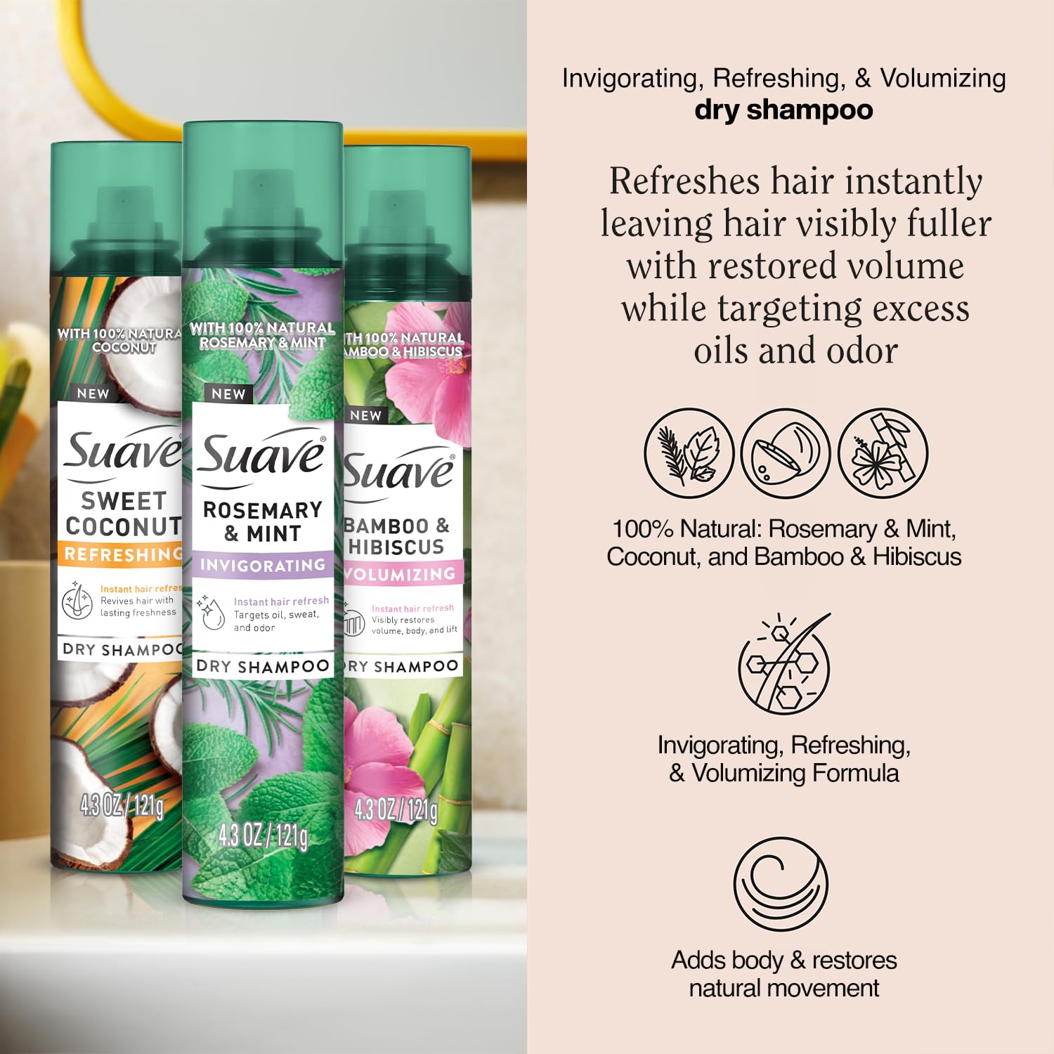 Suave+ Dry Shampoo Spray Variety 3-Pack – Invigorating Rosemary & Mint, Volumizing Bamboo & Hibiscus + Refreshing Sweet Coconut, 4.3 Oz Ea