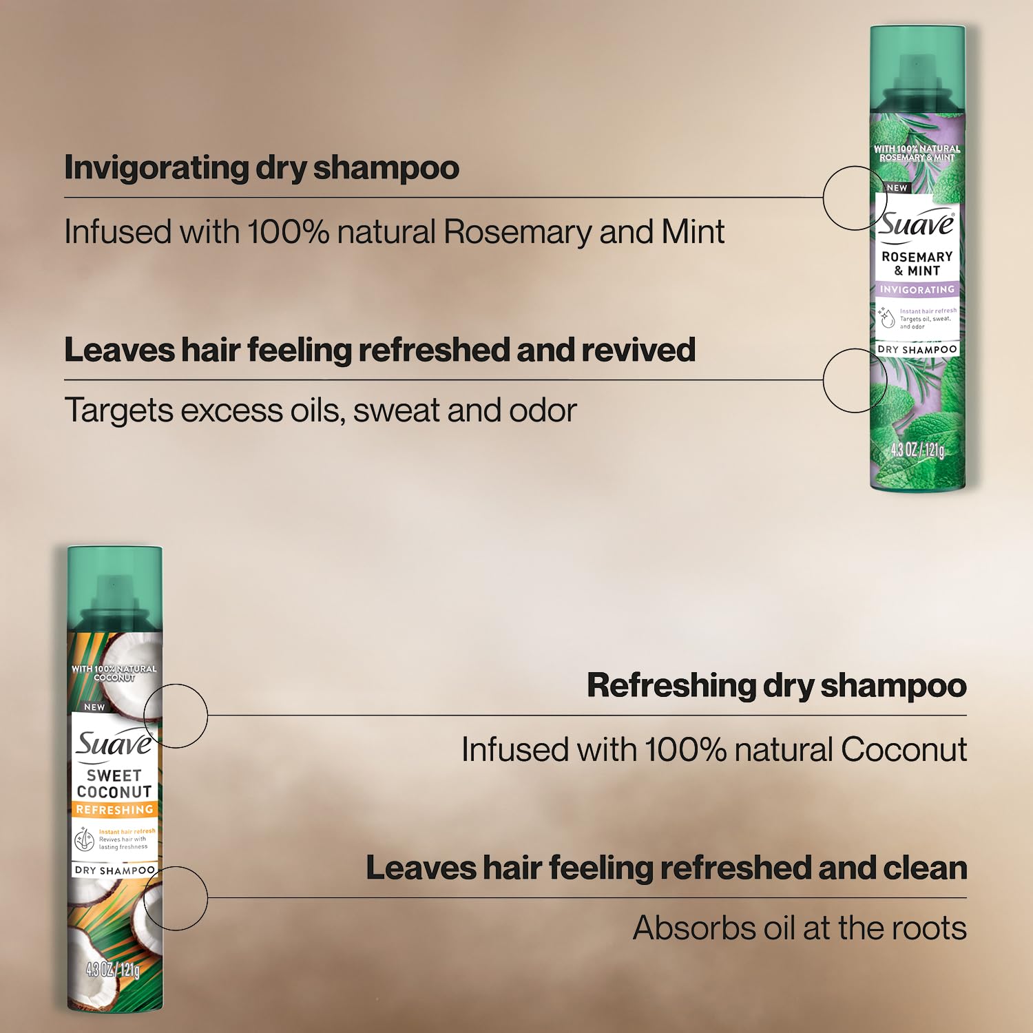 Suave+ Dry Shampoo Spray Variety 2-Pack – Invigorating Rosemary & Mint, Refreshing Sweet Coconut, 4.3 Oz Ea