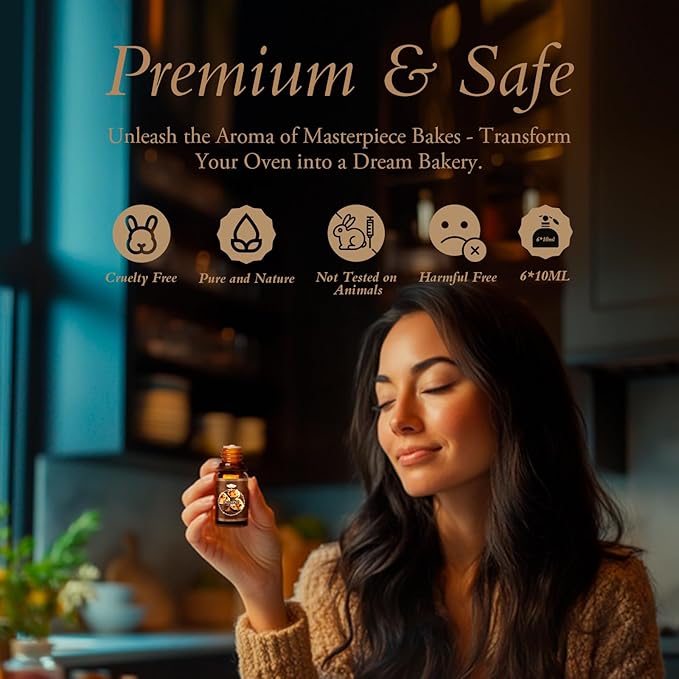 - 【Set Of 6 * 10ML Bakery Essential Oils】Irresistible Bakery Scents – Fill your home with the cozy warmth of Vanilla Bean, Cookies, Cinnamon Rolls, Cupcakes, Chocolate Crepes, and Bread. Perfect for holidays, relaxation, or nostalgic baking memories.