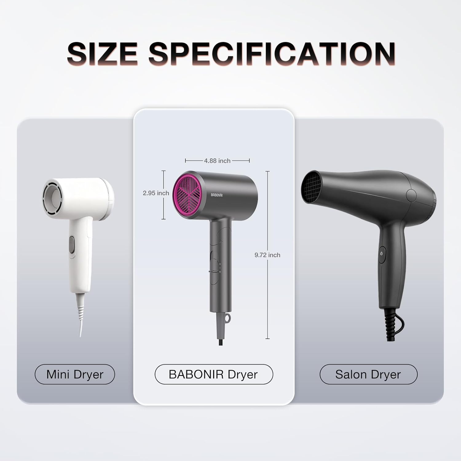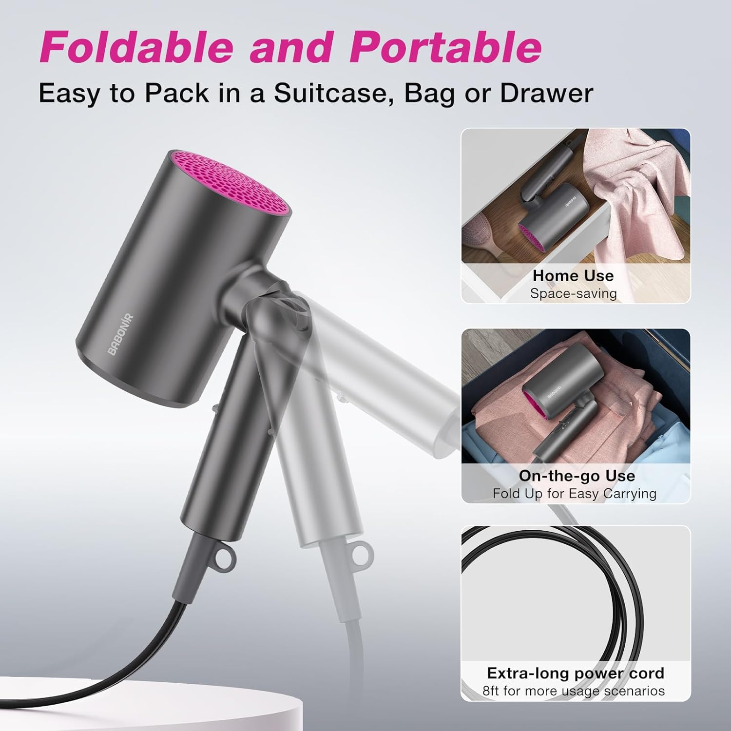 - [Compact and Portable Design] Weighing only 1.69 lbs and measuring 11.18 x 5.91 x 3.15 inches, this folding mini hair dryer is ultra-light and easy to store. Perfect for everyday home use, gym sessions, or short domestic trips across the U.S., it fits effortlessly in your bag for styling on the go