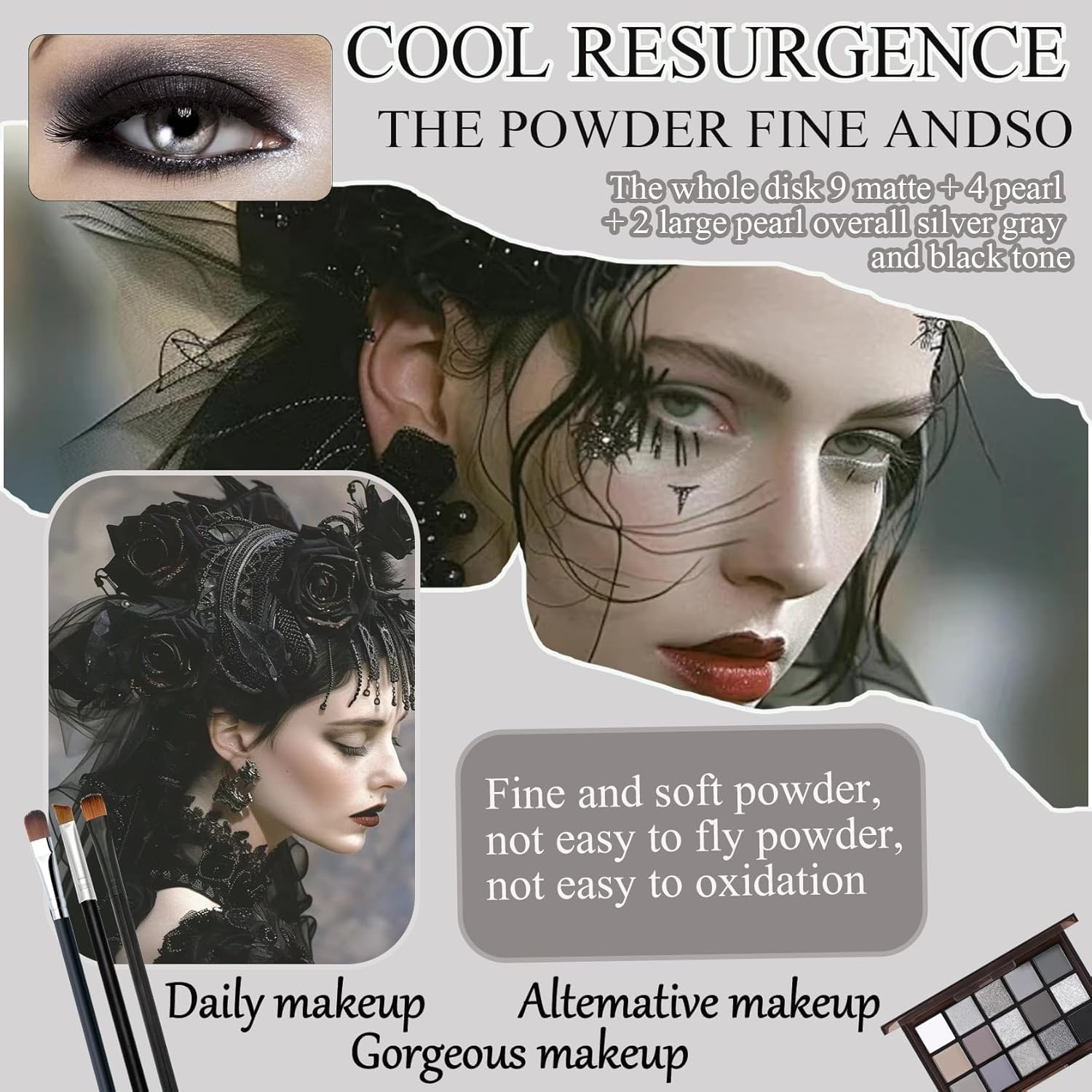 Black Grey Smoky Eyeshadow Palette,15 Colors Matte Shimmer Pigmented Eye Shadow Makeup Palette Set with 3 Eyeshadow Brushes,Glitter Eyeshadow Makeup Palette for Daily Halloween Goth Makeup(H)