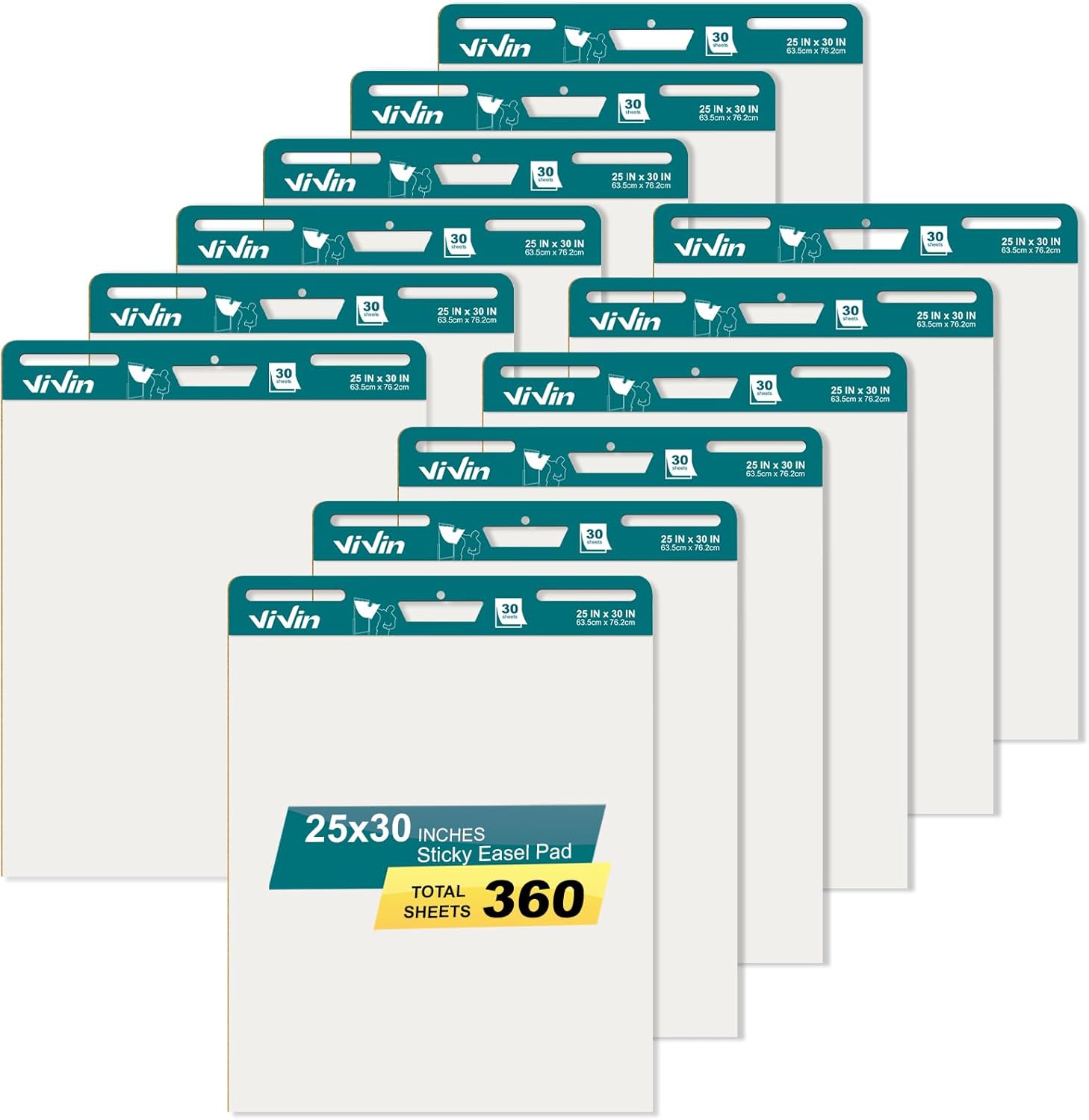 ViVin Super Sticky Easel Pad, 25 x 30 Inches Flip Chart Paper for Teachers, Large Self Stick Easel Paper, Teacher Anchor Chart, 30 Sheets/Pad, 12 Pads/Pack