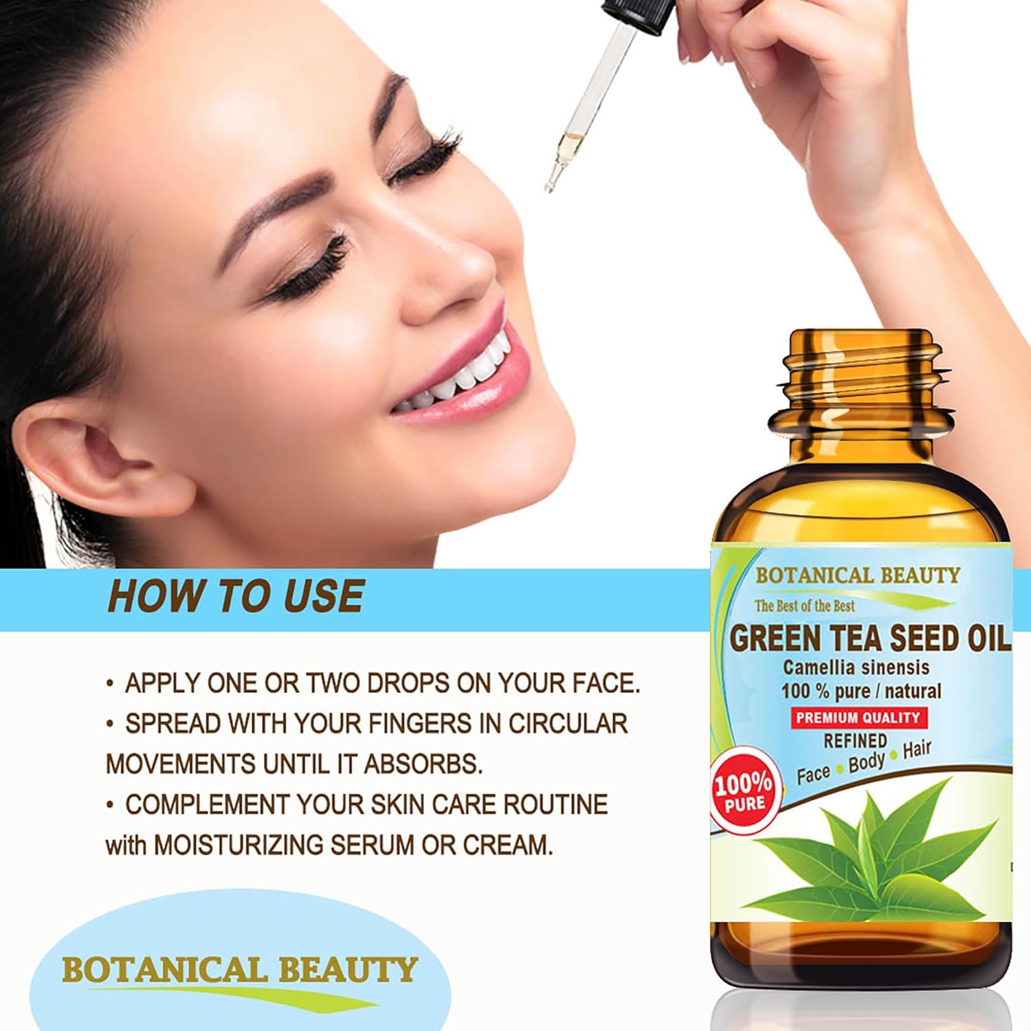 - GREEN TEA SEED OIL is a light, non-greasy oil that easily blends into the skin and leaves it smoother and more resilient. Unscented. Green Tea Seed Oil is natural hydration properties,. it is especially well suited for use in facial, lip, body, hair care and massage products. Botanical Beauty GREEN TEA SEED OIL is cold-pressed from the seed of the Camellia Sinensis to create a viscous oil that is clear, pale yellow to light in color with a bland to slightly oil odor. Moisturizer for Face, Dry Skin, Body, Damaged Hair, nails, Anti-Aging Face Oil.