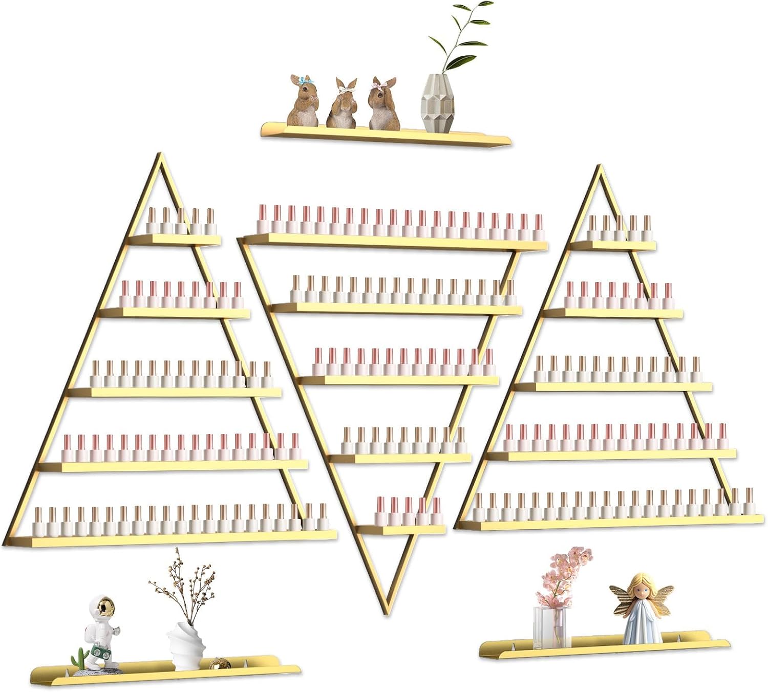 - 【Premium Golden Display Rack】: EBANKU metal cosmetic display racks include 3 5-layer triangle holders and 3 horizontal bars, which make your nail polish neatly displayed and clearly visible so that you can find the style you want quickly.