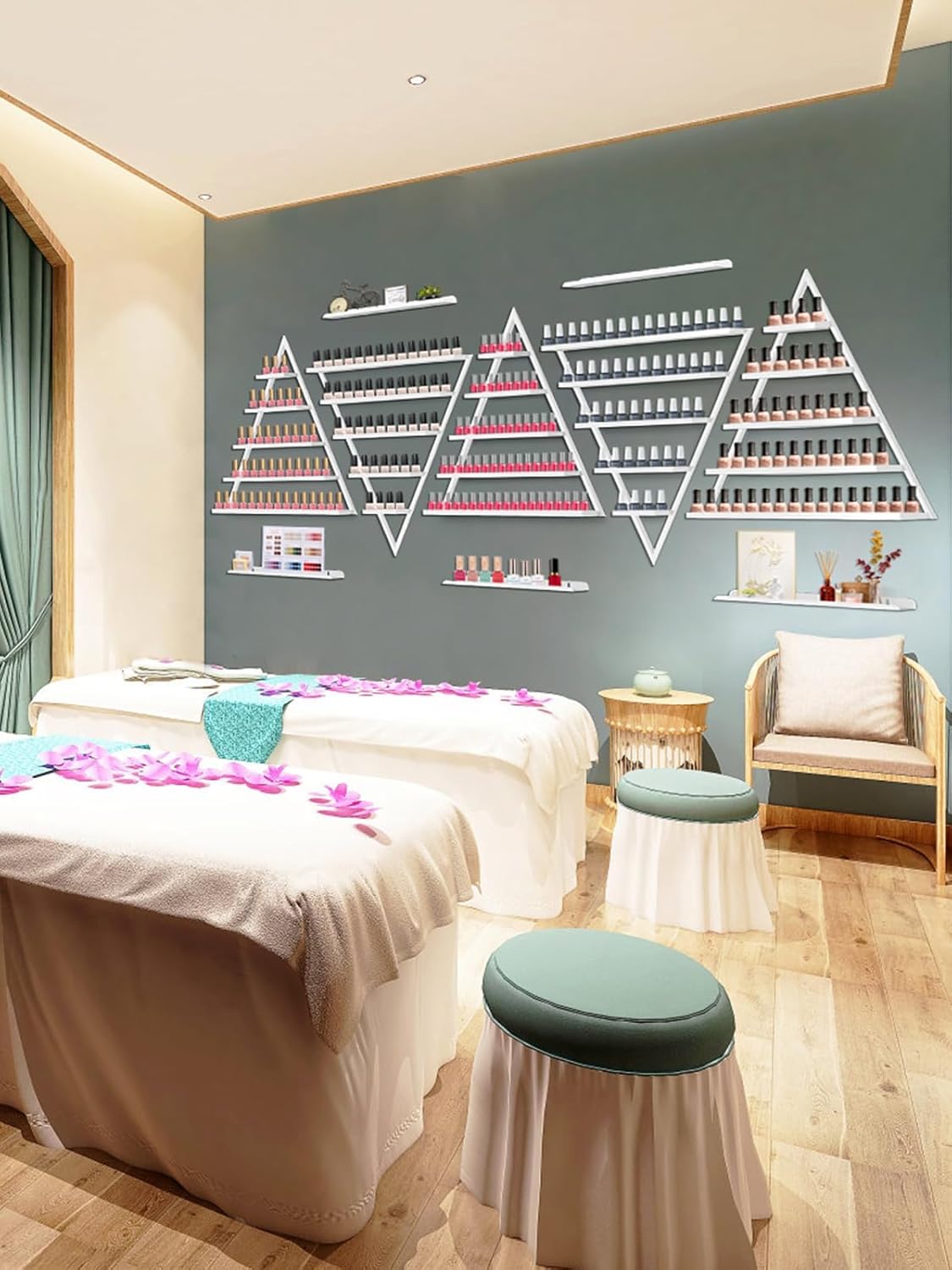 - 【Multi Function】: The triangular shelves are not only suitable for nail salons but also for home use, spa, and shop, perfect for interior decoration, do not take up much space and aesthetically pleasing, can be used to accommodate kinds of items like cosmetic bottles, perfume, lipstick, vase, eyeglasses, photo frame, etc.