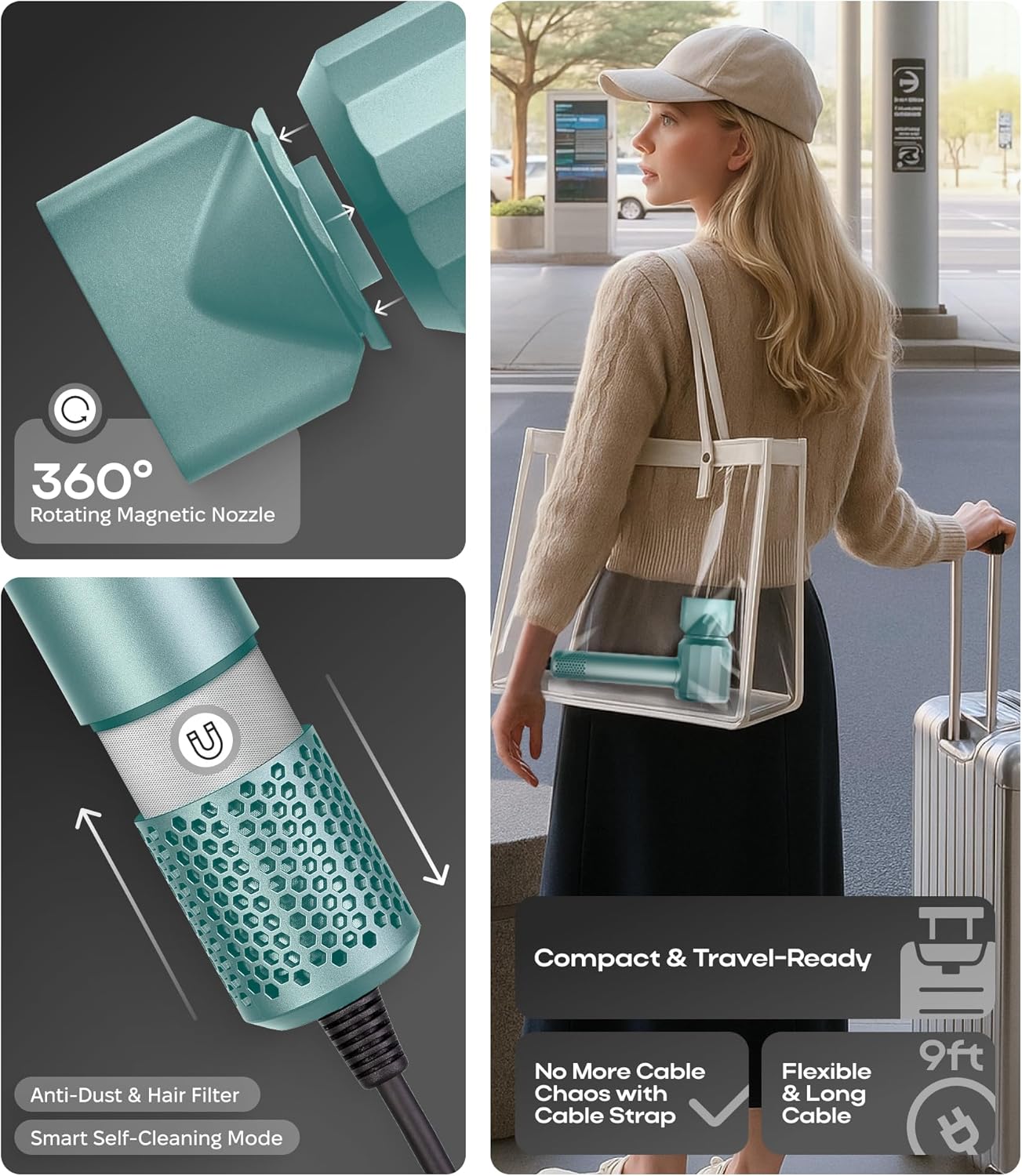 - Magnetic Attachment Technology. This small salon blower features advanced magnetic attachment tech. The 360° rotating nozzle and built-in filter snap in place using magnets. No twisting, no hassle—just effortless styling and easy maintenance