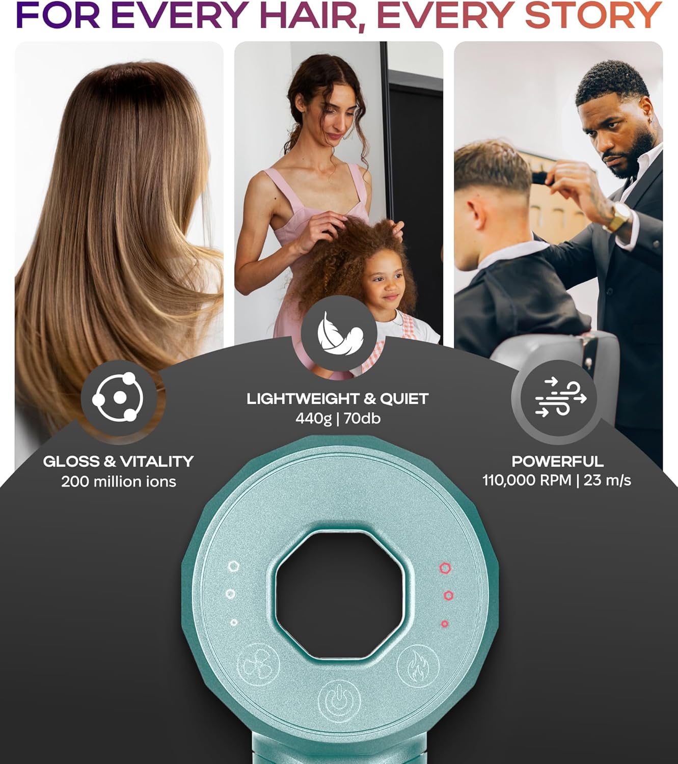 - Power meets care! The professional innovative high-speed brushless motor 110,000 RPM, intelligent temperature control system, 200 million ions, and laminar airflow ensure fast blowdrying, keeping hair healthy, smooth & shiny. Powerful and caring