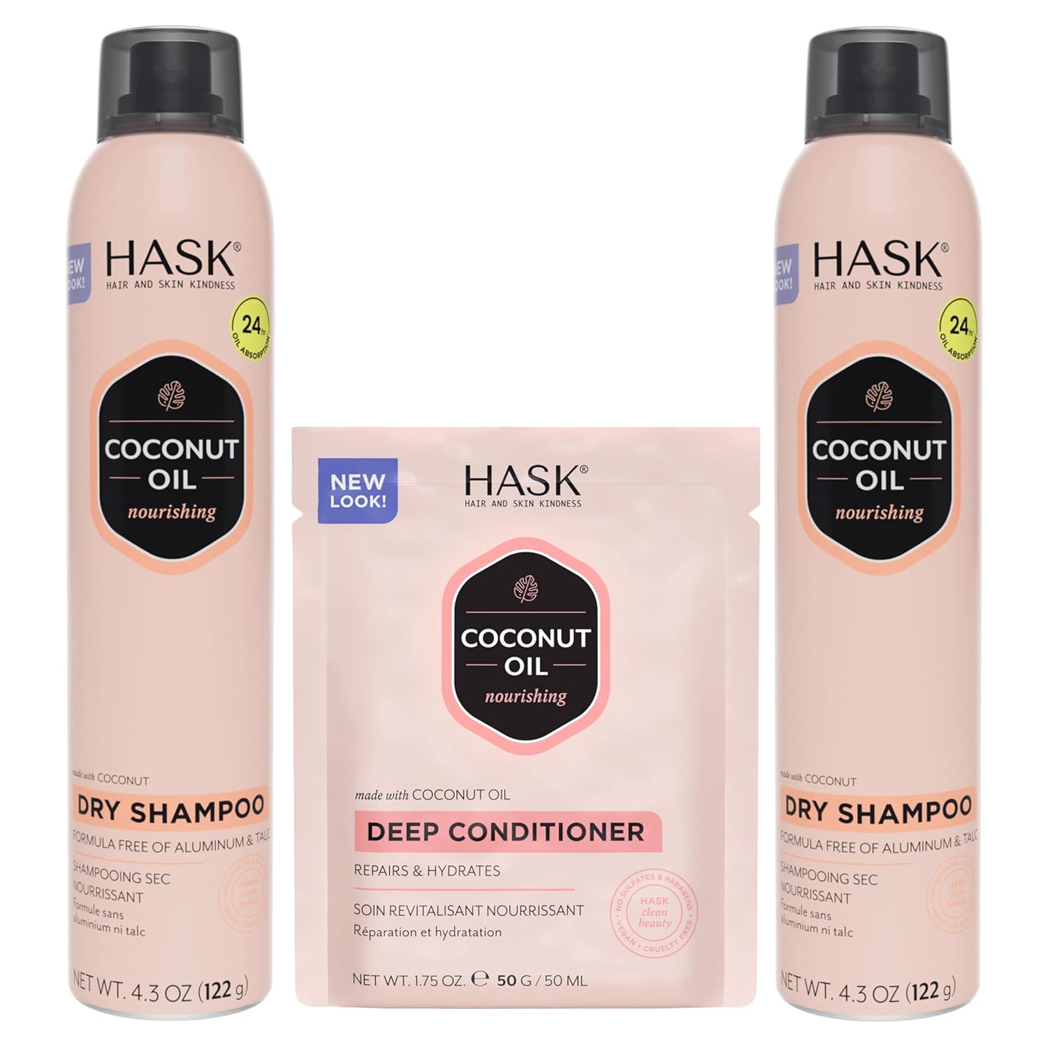 HASK Dry Shampoo Duo (4.3oz-Qty 2) & Deep Conditioner Packette, Aluminum-Free, Sulfate-Free, Paraben-Free, Color Safe, for All Hair Types (Coconut)