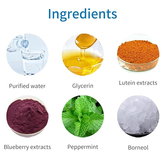 - Active ingredients: Purified water, Glycerin, Blueberry extracts, Lutein extracts, Peppermint, Borneol,which are natural and effective skincare ingredients, can quickly penetrate into the muscle bottom and deeply moisturizing eye skin