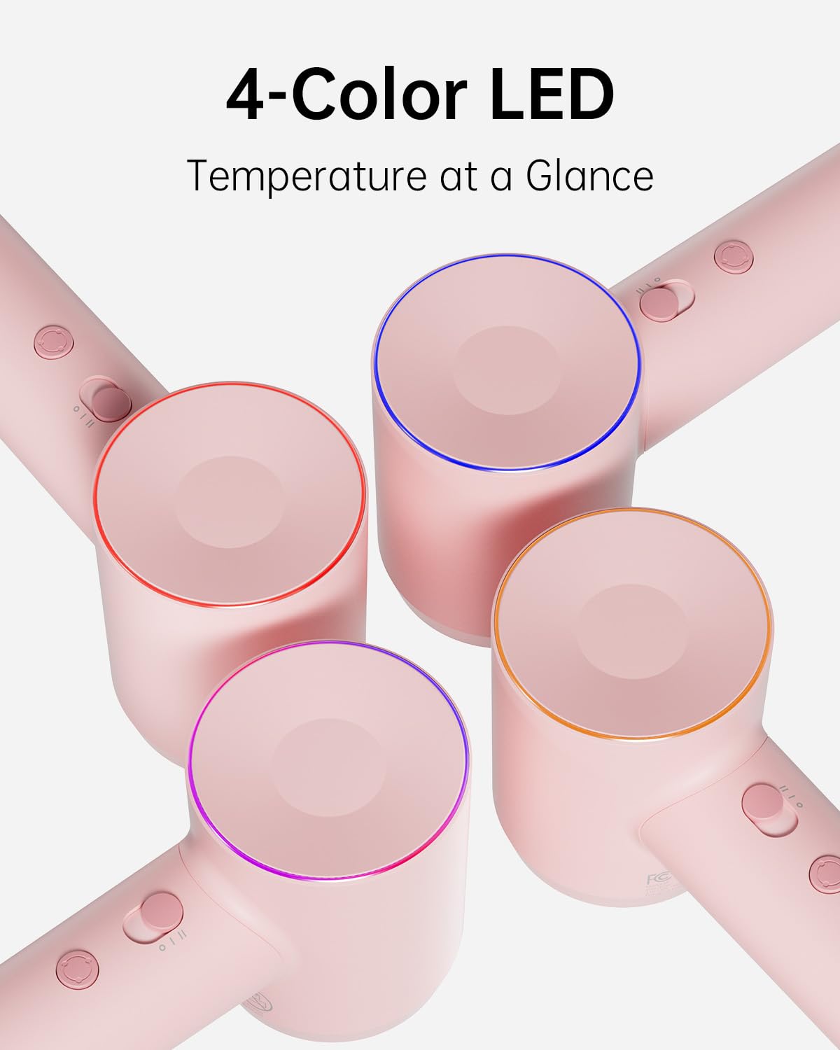 - [4-Color LED Ring Light & Low Noise] The three colors displayed on the circular LED ring correspond to temperature settings of hair dryer. Red indicates 80 degrees (hot air), yellow is 50 degrees (warm air), blue is cold air. Press and hold for two seconds to activate circulating mode shifting hot and cold air every few seconds. Despite the powerful motor and wind speed, the Laifen hair dryer operates at 59db while in use and is non-disruptive.