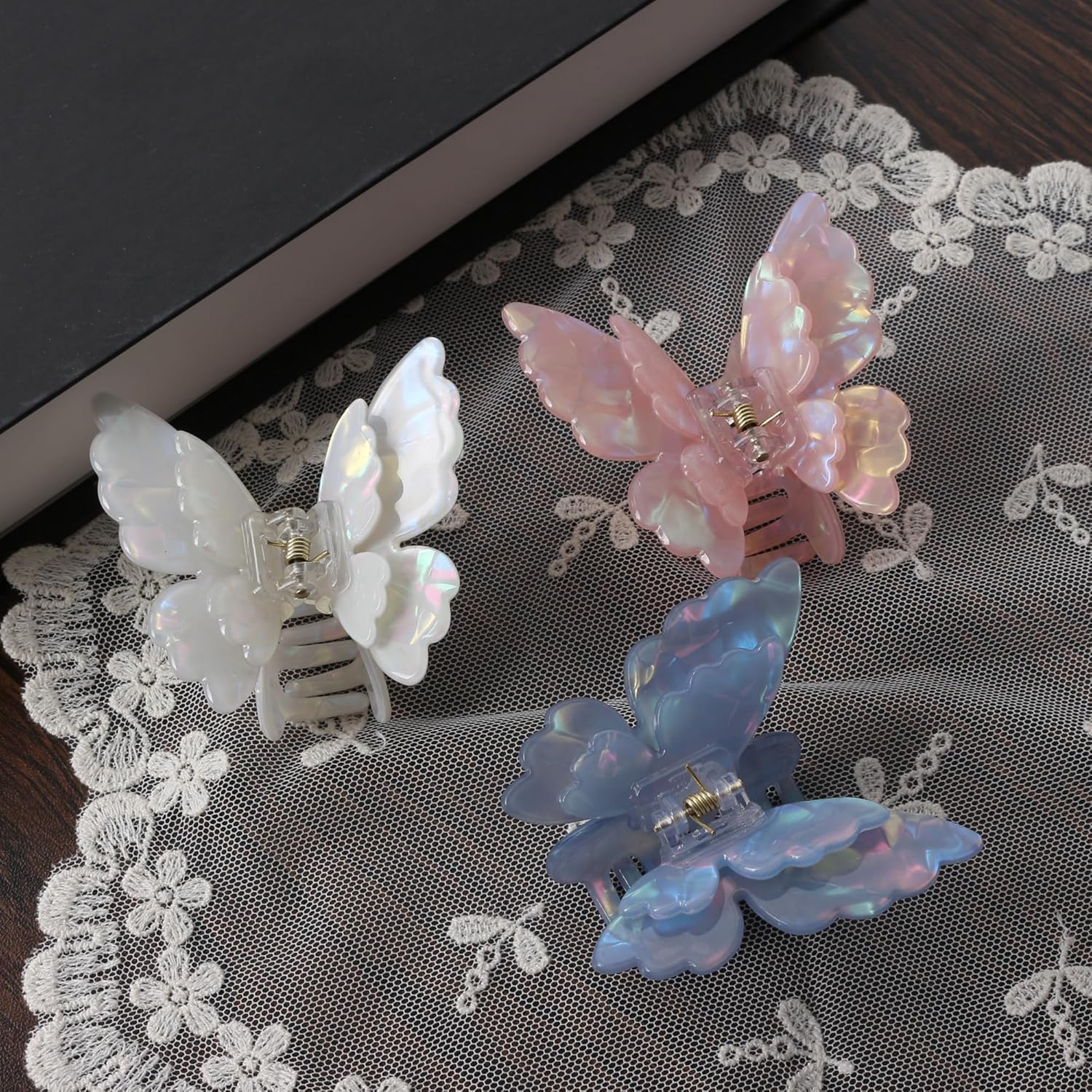 - Package included: Butterfly design barrettes with tortoise shell patterns 3 Pcs butterfly hair clips, which contain 3 different Mixed color, White, Blue, Pink.
