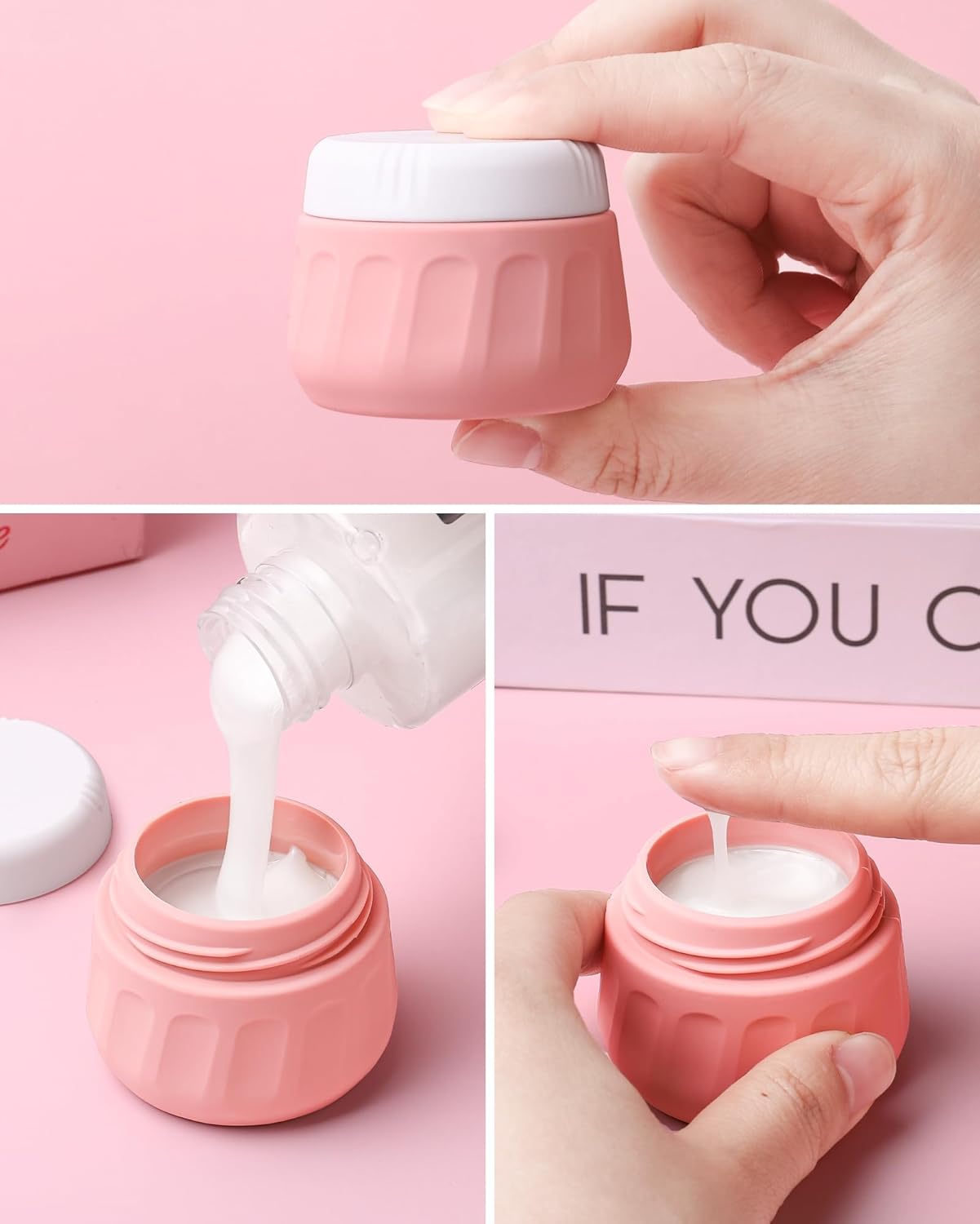 - Travel Size Toiletries: Set includes 4 silicone squeeze bottles 3oz(90ml) and 4 silicone cream jars 1oz(30ml) and clear make-up bag 6.46x2.87x5.31inch. Contents identification label sticker included