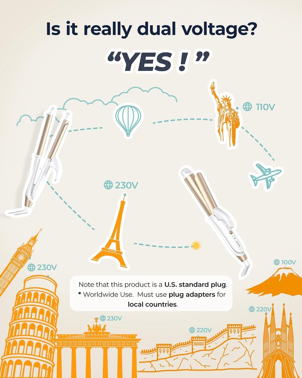 - Voltage Chaos? Auto-Safe for EU Travel: Dual voltage curling iron can auto-adjust 110V-240V with Real-time LED voltage display for peace of mind.UL certified cord, safe anywhere.