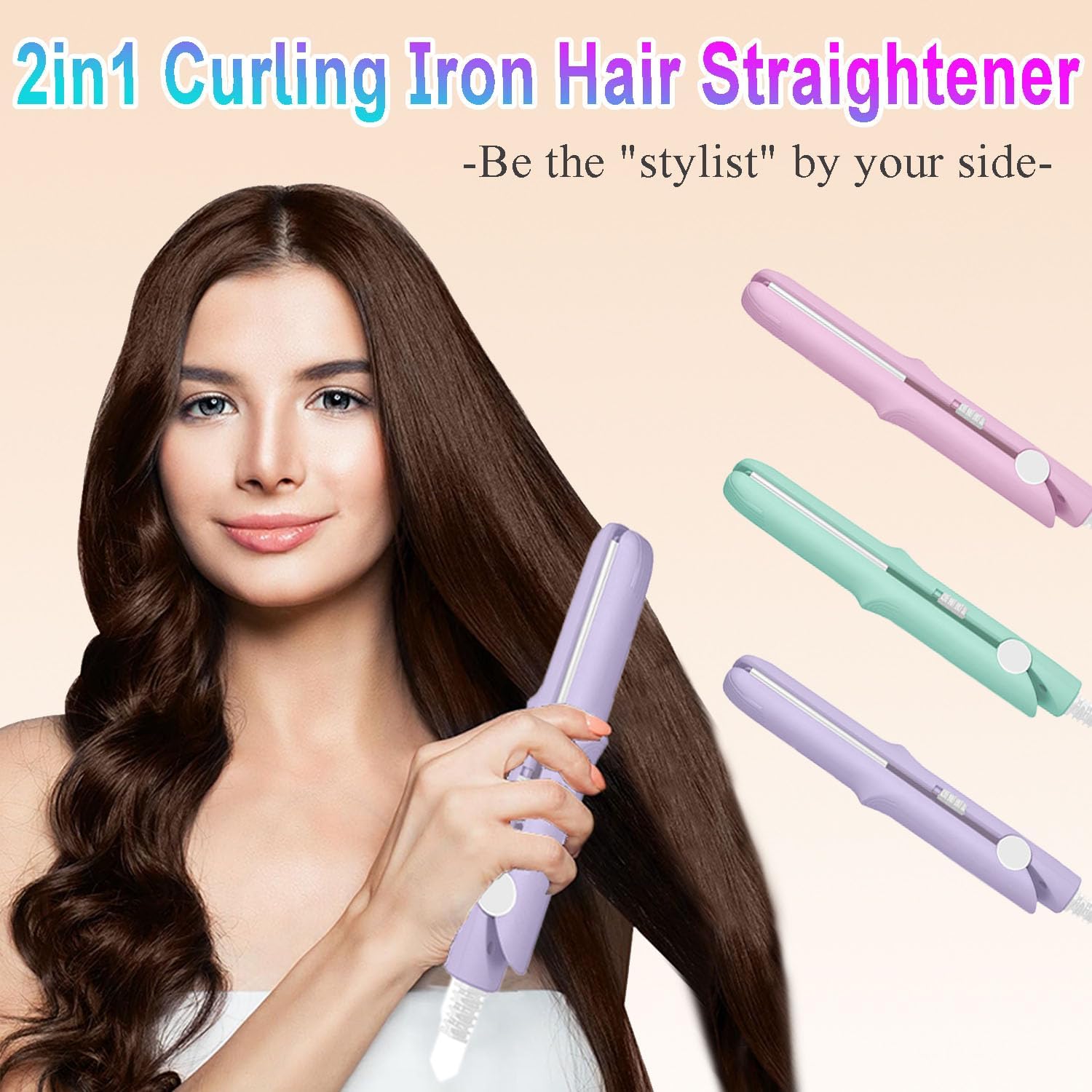 2025 New 2 in 1 Mini Dual Purpose Curling Iron, Mini Curling Wand Flat Iron Hair Straightener, Portable Travel Curl Wand for Women Short and Long Hair (Light Purple)