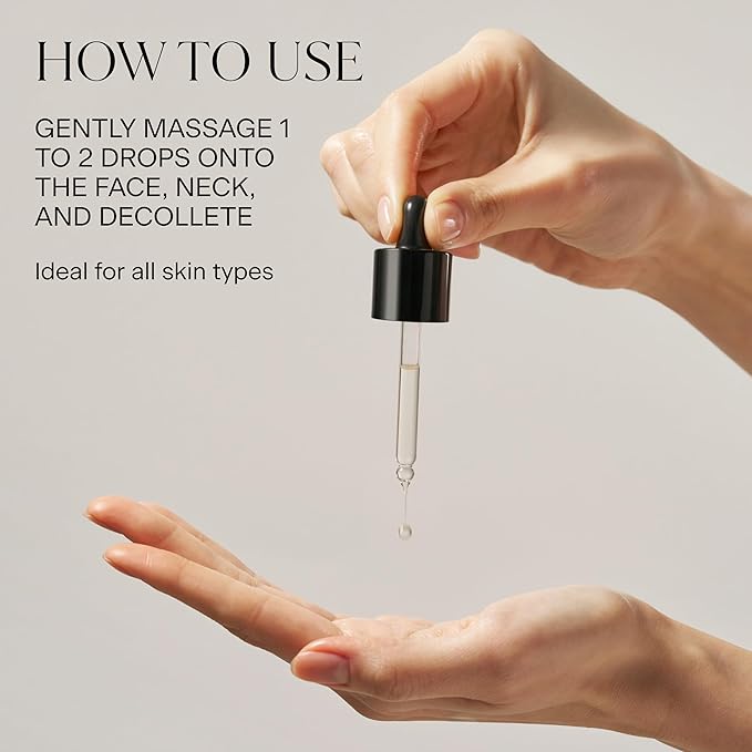 - Gently massage 1–2 drops onto the face, neck, and décolleté as the final step in your skincare routine to lock in moisture and amplify your natural glow.