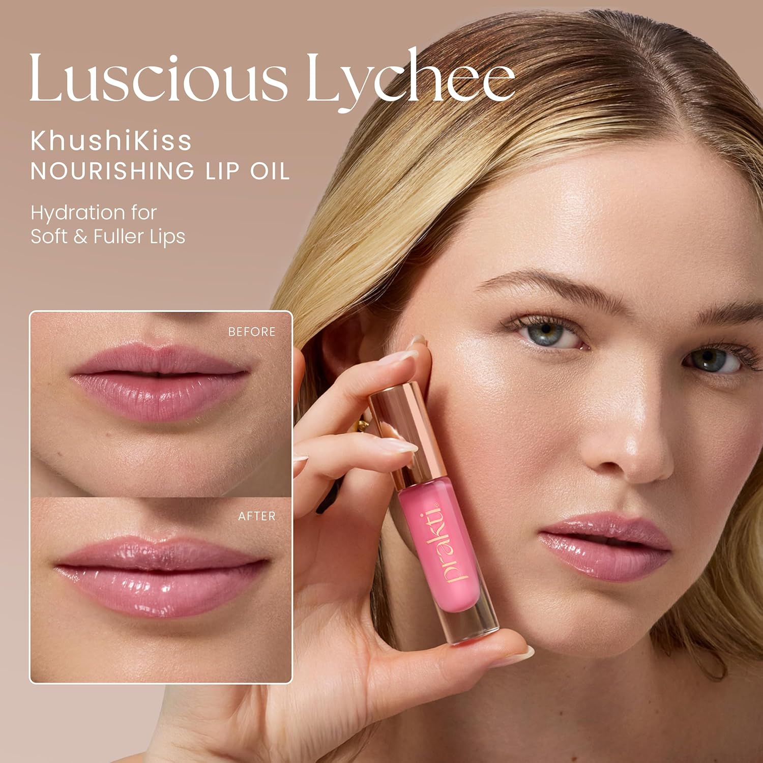 Prakti KhushiKiss Nourishing Lip Oil in Luscious Lychee, Hydrates & Plumps Lips, High-Shine Finish, with Hyaluronic Acid & Peptides, 0.17 oz
