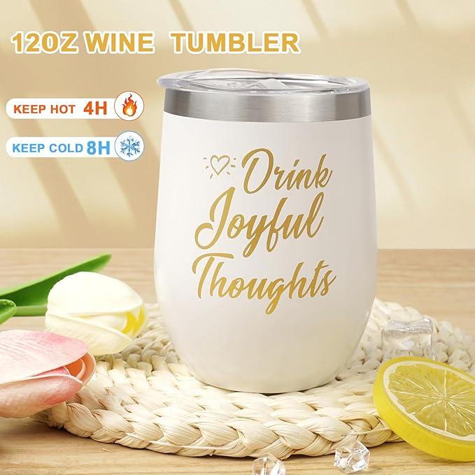- 12OZ Insulated Cups:Made of 18/8 food-grade sturdy stainless steel, with double-walled vacuum insulation, this sweat-free 12oz insulated tumbler with lid can preserve beverage temperature up to 8h for cold & 4h for hot, great for iced coffee, tea, wine, juice, champagne, smoothies, sodas, milkshake, etc; "Drink Joyful Thoughts",positive quote brings her smile & happy mood every day,making it an ideal relaxation gifts for her friendship gifts for women