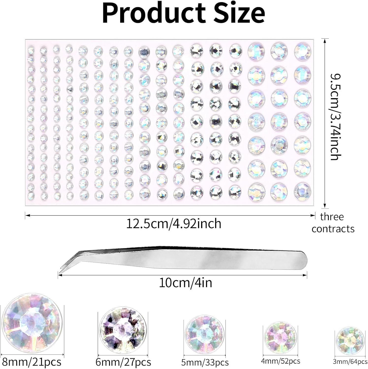 - Rhinestones for Face: These self-adhesive face rhinestones are available in 3mm, 4mm, 5mm, 6mm, and 8mm sizes, and the various sizes are more convenient for you to use in makeup and DIY decorations. Face jewels stick on with medical-grade hypoallergenic adhesive, perfect for sticking on your eyes, face. Needn’t prepare additional glue and save your time and energy