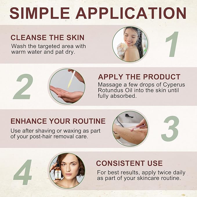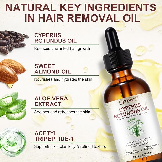 - Reduces Unwanted Hair Growth:Cyperus Rotundus Oil helps naturally reduce body hair growth over time. this product works gently to slow down hair regrowth, giving you smoother and softer skin.