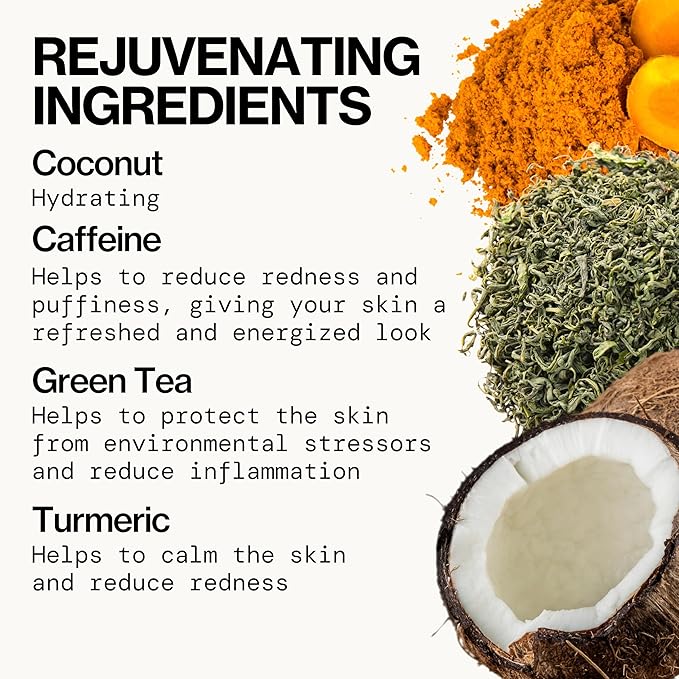 - Energizing & Calming Ingredients: Infused with Coconut water to provide a burst of lightweight hydration and nourish the skin barrier, plus Caffeine to depuff and awaken your complexion. Antioxidant-rich Green Tea works to combat redness and inflammation, while Turmeric (a superfood spice) further helps soothe and even out skin tone. Together these skin-loving ingredients leave you looking refreshed and well-rested – even if you’ve been running on fumes.