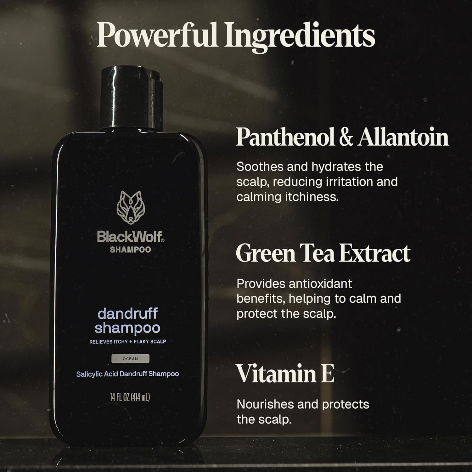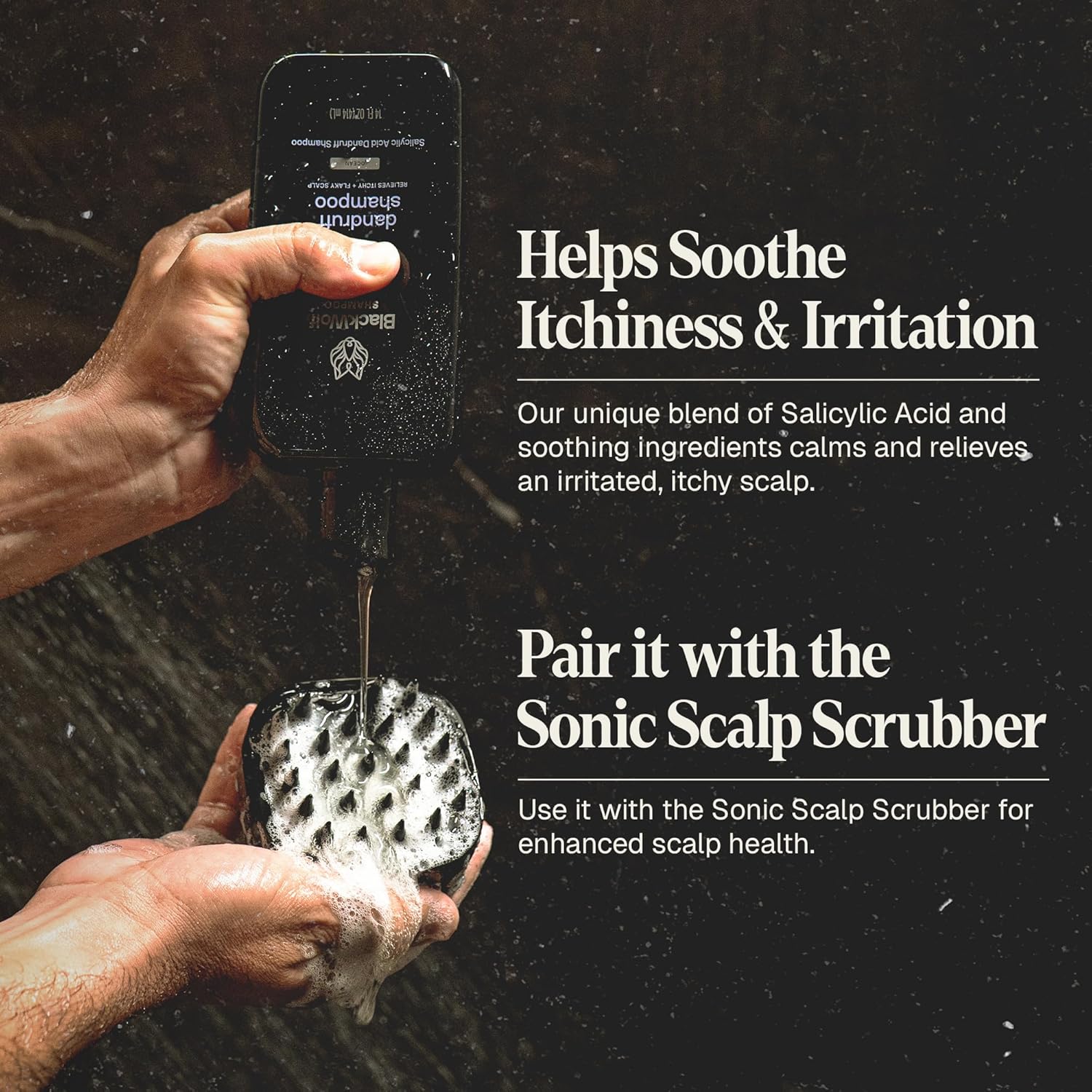 - Anti Dandruff Shampoo: Experience the ultimate in scalp care with Dandruff Shampoo by Black Wolf for men. Formulated with Salicylic Acid, this shampoo works up a rich, cleansing lather to control dandruff, itchiness, and alleviate irritation. 14 oz bottle.