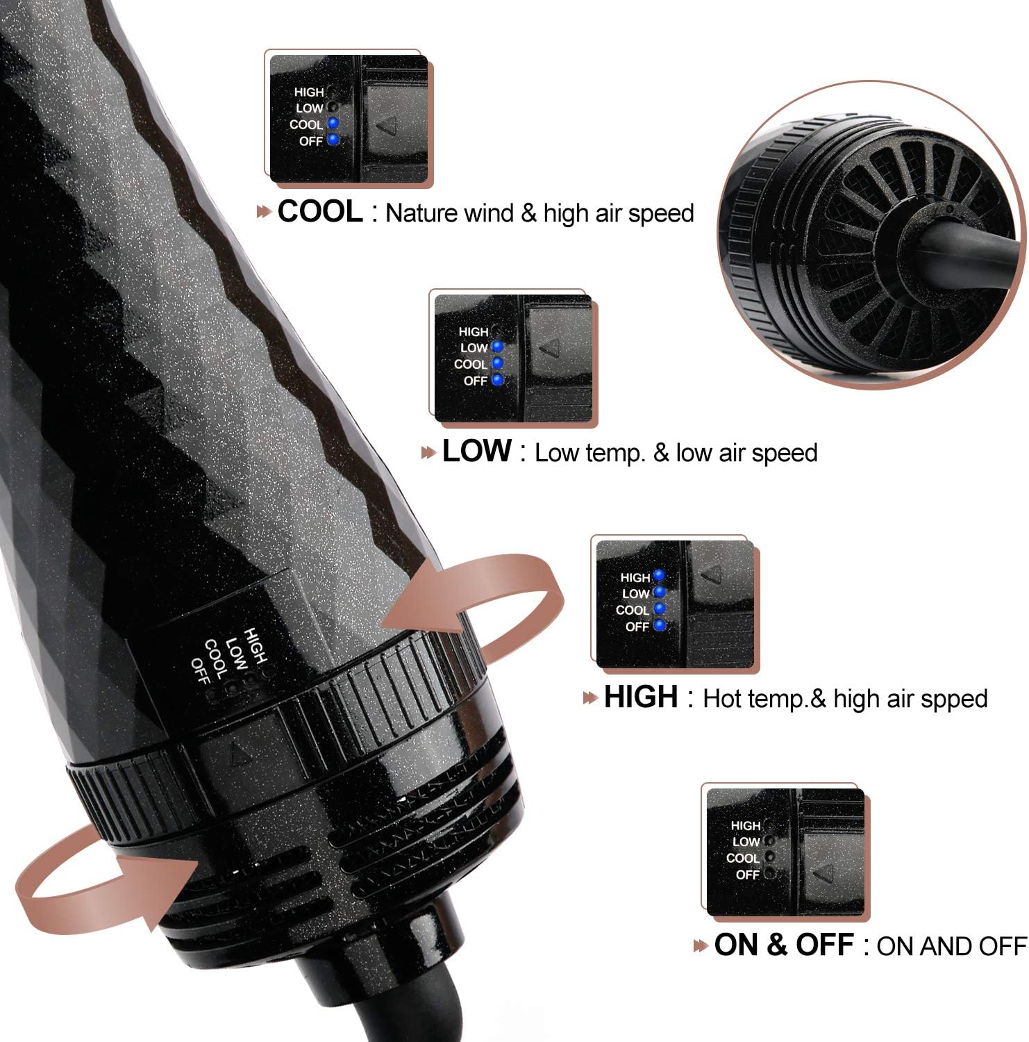 - 3 OPERATION MODES: 1100 Watt power delivers, 3 adjustable heat levels for different hair types, high heat for thick hair, low heat for fine hair, flexible setting to lock in your beautiful hairstyle.Rotary button design," Cool"-- nature temp. and high speed; "Low"-- medium temperature and low speed;"HIGH"-- high temperature and high speed