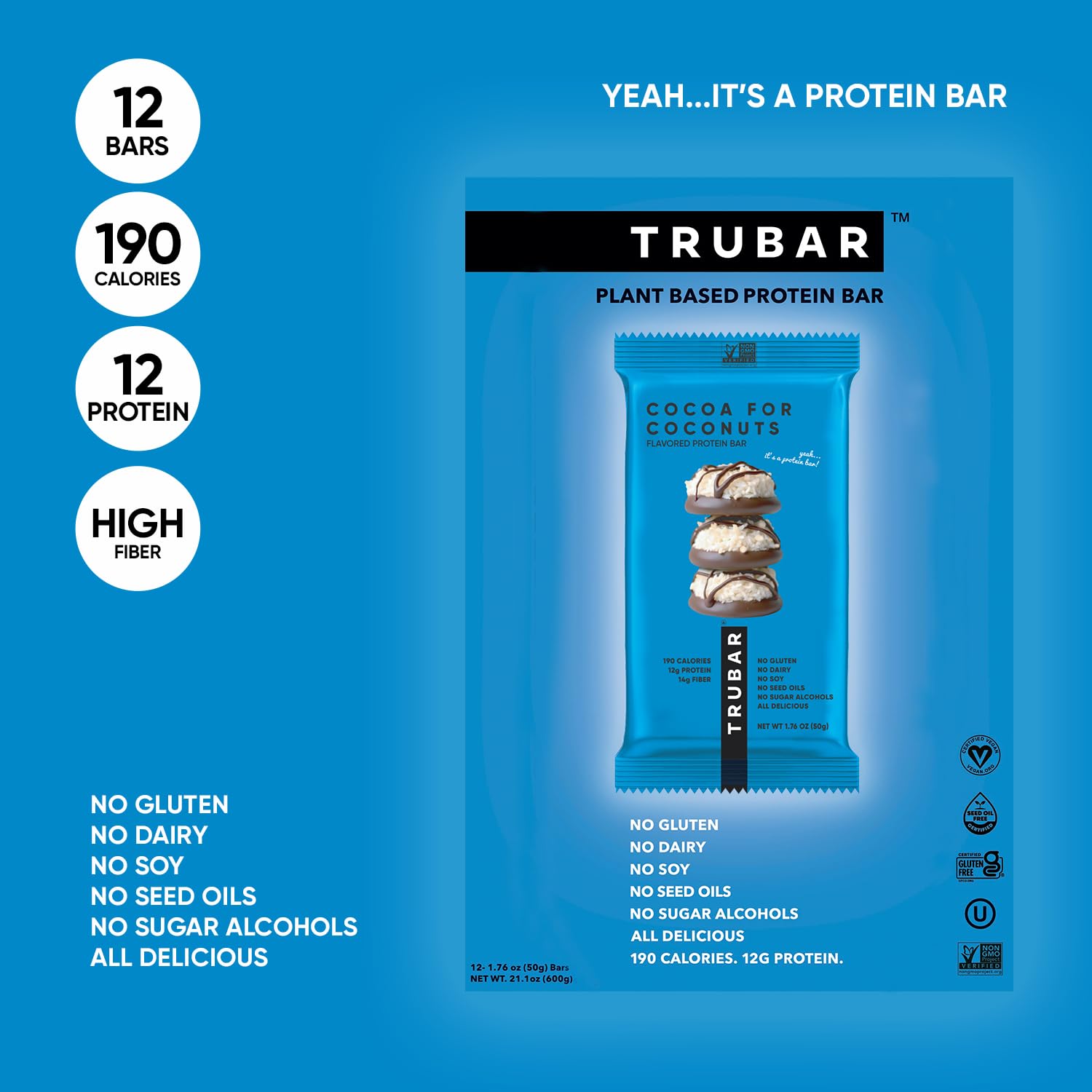 TRUBAR Vegan Protein Bar, Cocoa For Coconuts, Gluten Free, Plant Based Protein, Dairy Free, Non GMO, Soy Free, No Sugar Alcohols, 12G Protein, 12G Fiber, 23G Carb, On the Go Snack Bars, 12ct
