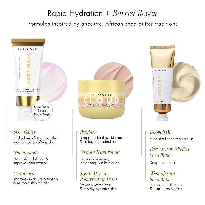 - GENTLE CLEANSING + RICH HYDRATION: Start your routine with the Butter Cream Body Wash, a non-stripping cleanser that leaves skin soft and clean. Follow with our Barrier Repair Cloud Cream for a luxurious layer of moisture that supports your skin's barrier and seals in hydration.