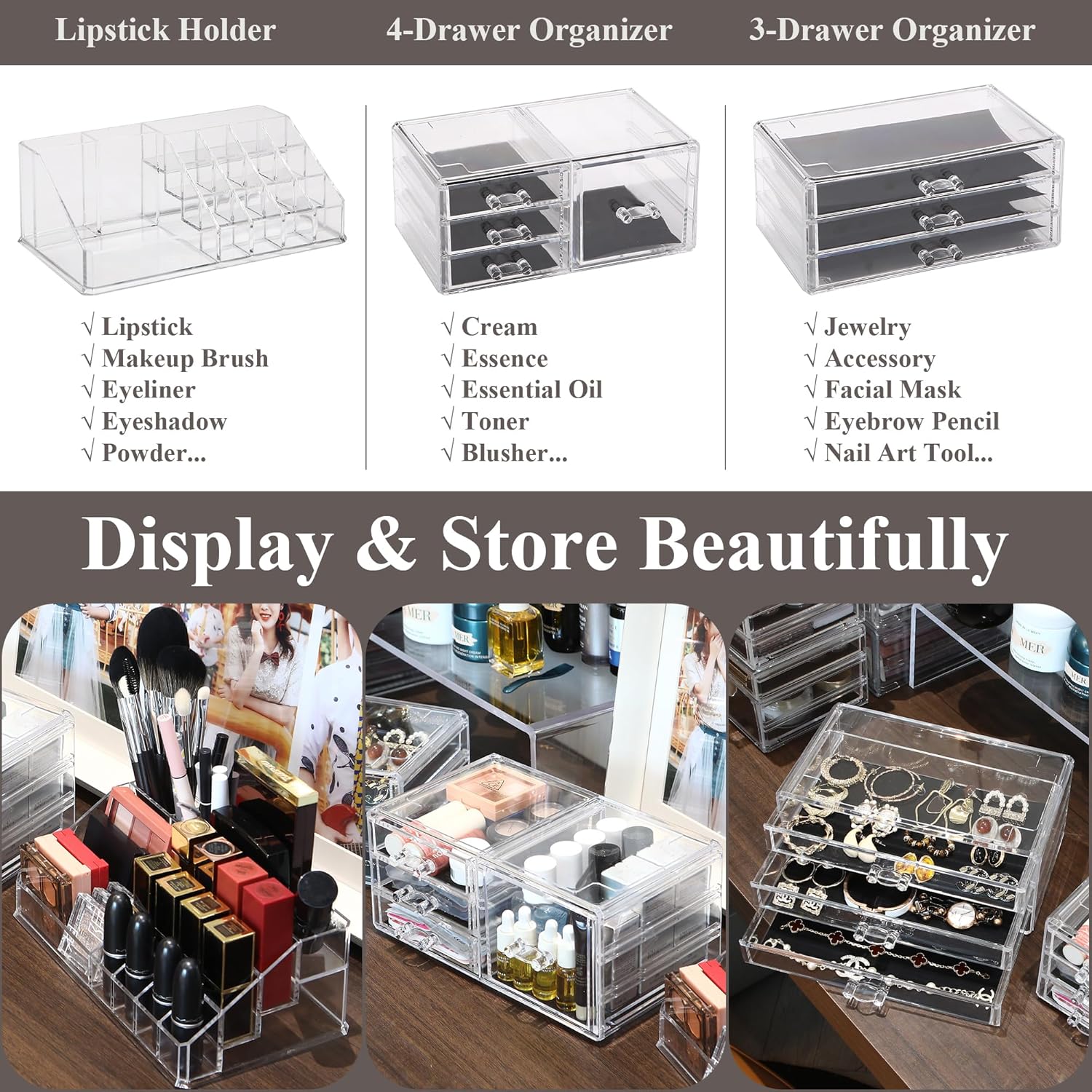 - DISPLAY & STORE BEAUTIFULLY - From cosmetics to jewelry, this organizer is versatile enough to suit any storage needs. With 7 drawers and 1 lipstick holder, you can store all your beauty essentials in one convenient place