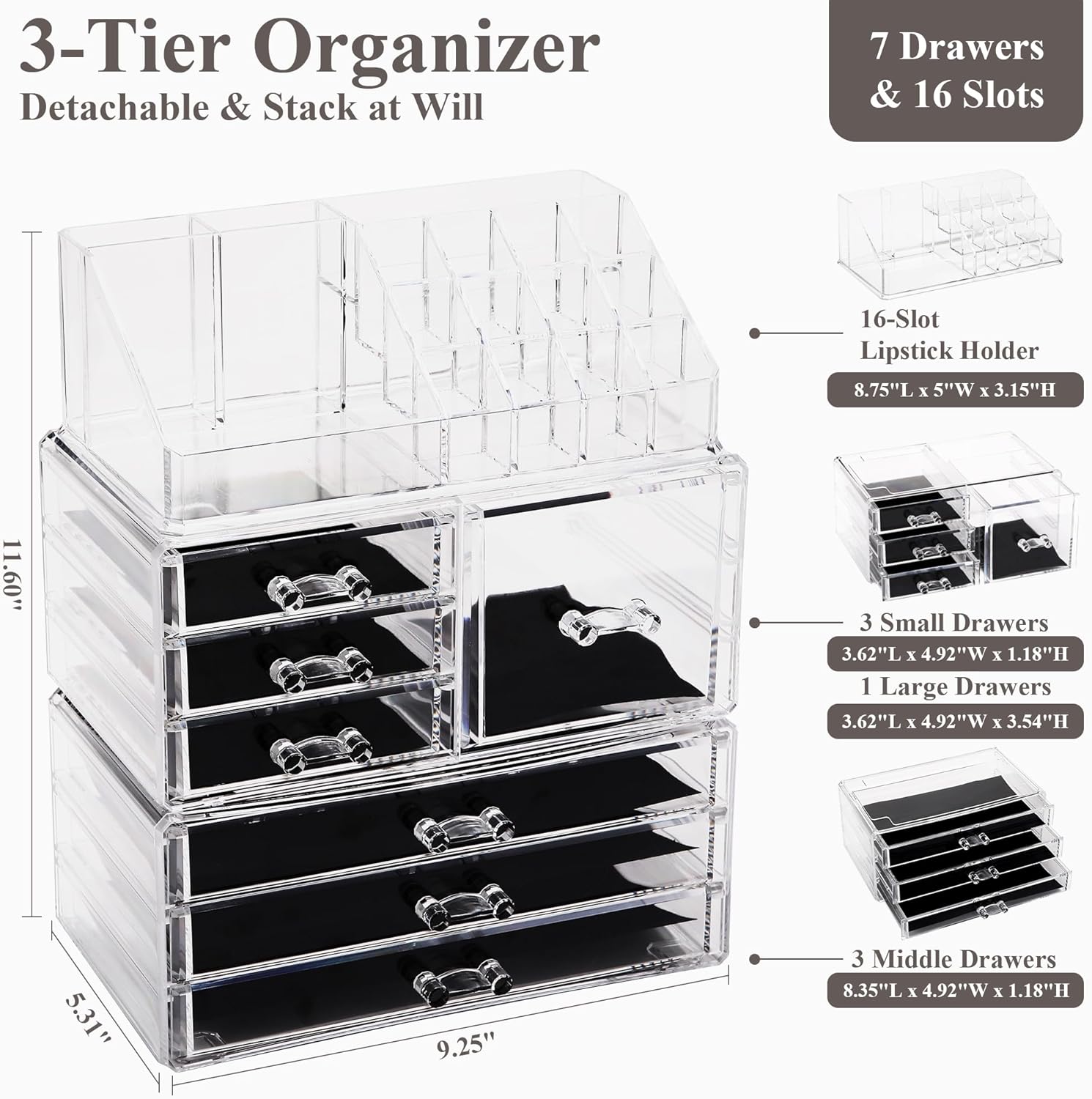- DURABLE & STURDY - Made of sturdy and durable acrylic plastic, this makeup organizer is built to last. Drawers slide open smoothly, and easy grip handles make them effortless to use. Measures approximately 9.25” L x 5.31” W x 4.25” H (drawers from 1.10 to 2.36" deep)