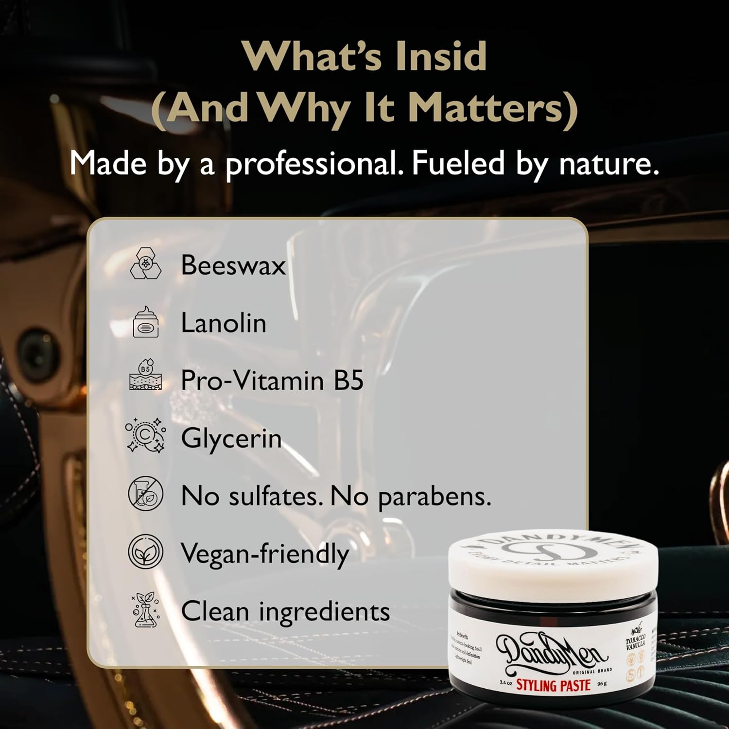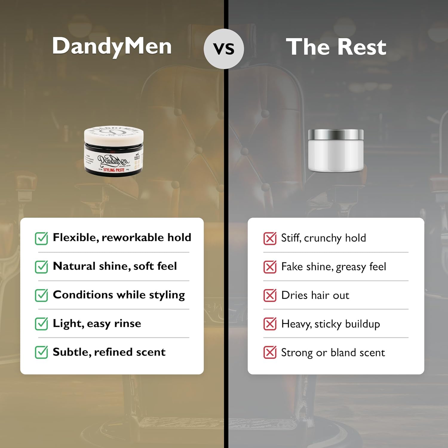- VERSATILE MEDIUM HOLD - DandyMen Styling Paste offers the perfect balance of control and flexibility, allowing you to create polished, classic looks or textured, laid-back styles that stay in place all day.