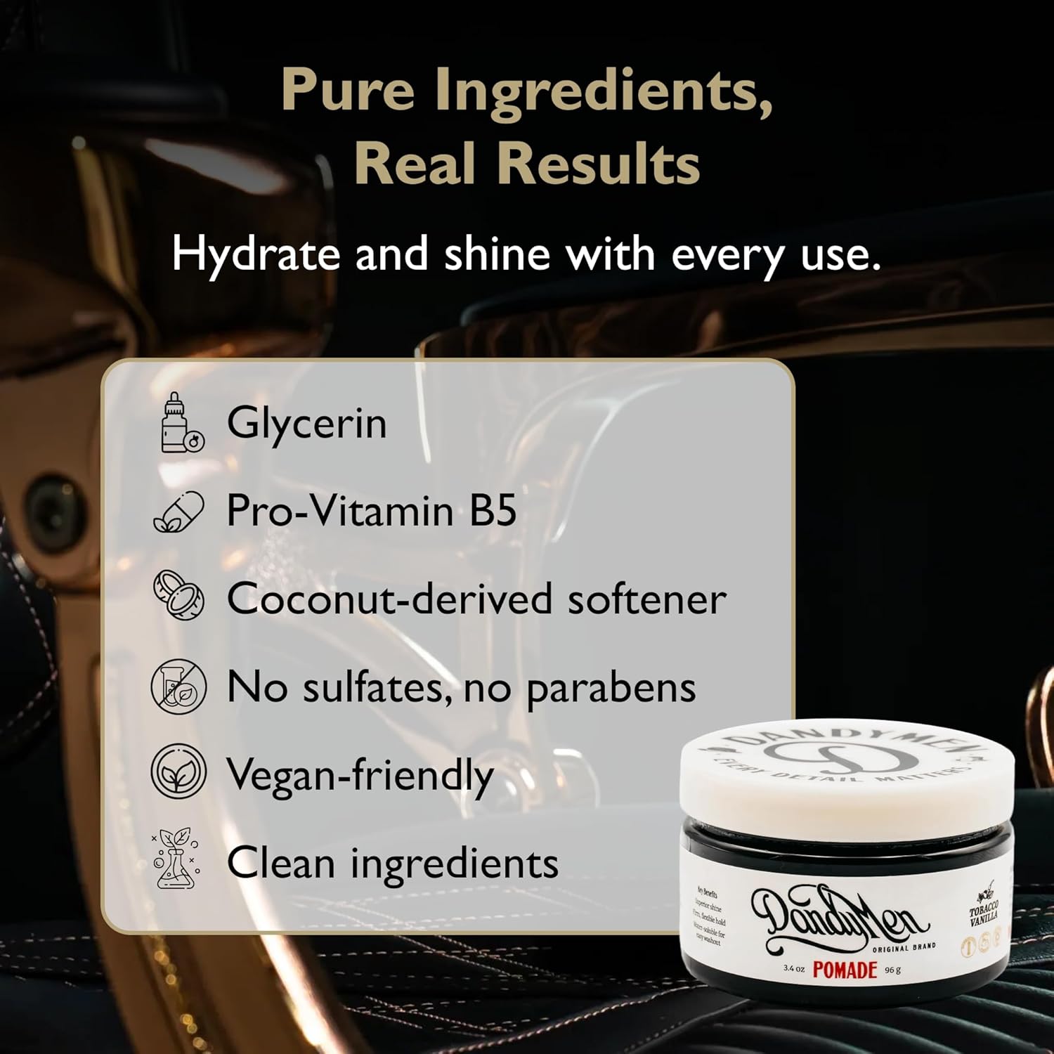- POLISHED, SLICK STYLE - Achieve sharp, defined styles like slick backs, pompadours, or side parts. DandyMen Pomade offers strong hold and a high-shine finish that lasts all day.