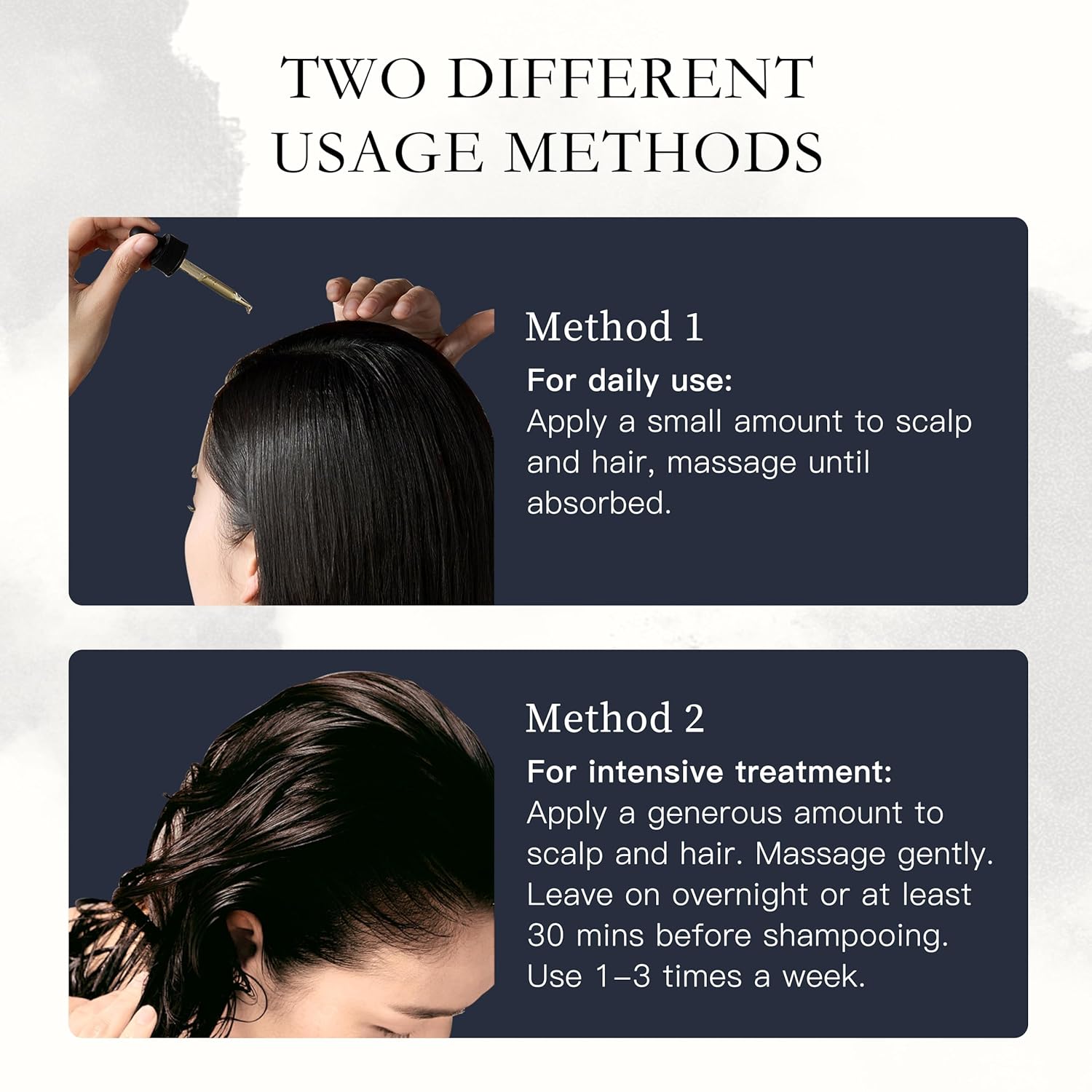 - Easy Application- Method 1( For Daily Use) : Massage a small amount to scalp and hair, massage until absorbed. Method 2 (For Intensive. Treatment) : Apply a generous amount to scalp and hair, massage gently. Leave on overnight or atleast 30 minutes before shampooing. Use 1-3 times a week Enjoy the earthy aroma and watch your hair transform!