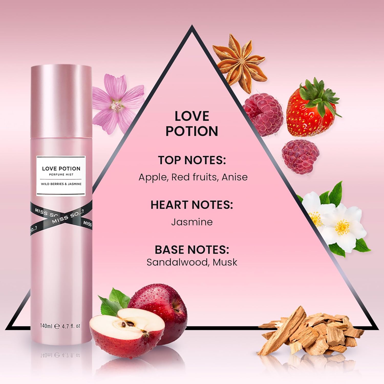 - Intriguing Scent Profile: Our Love Potion Perfume Mist is a women's perfume with a unique blend of musky, woody, floral, and fruity notes and top notes of apple, red fruits, and anise.