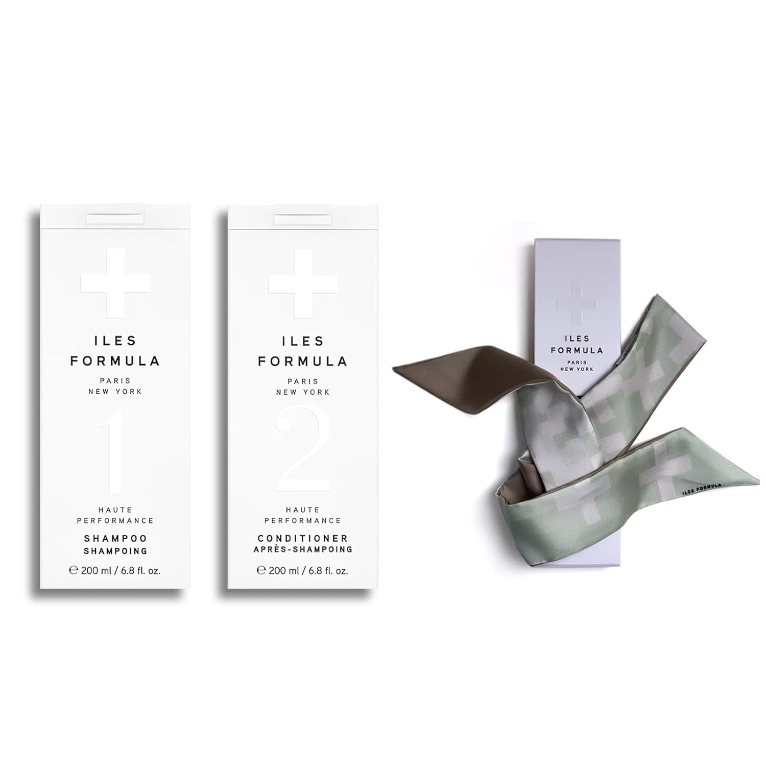 ILES FORMULA Haute Performance Shampoo + Conditioner + 100% Silk Hair Tie Set – Deep Cleanse, Detangle & Repair Damaged Hair – Color Safe, Sulfate-Free, for All Hair Types & Extensions (200 ml Each)