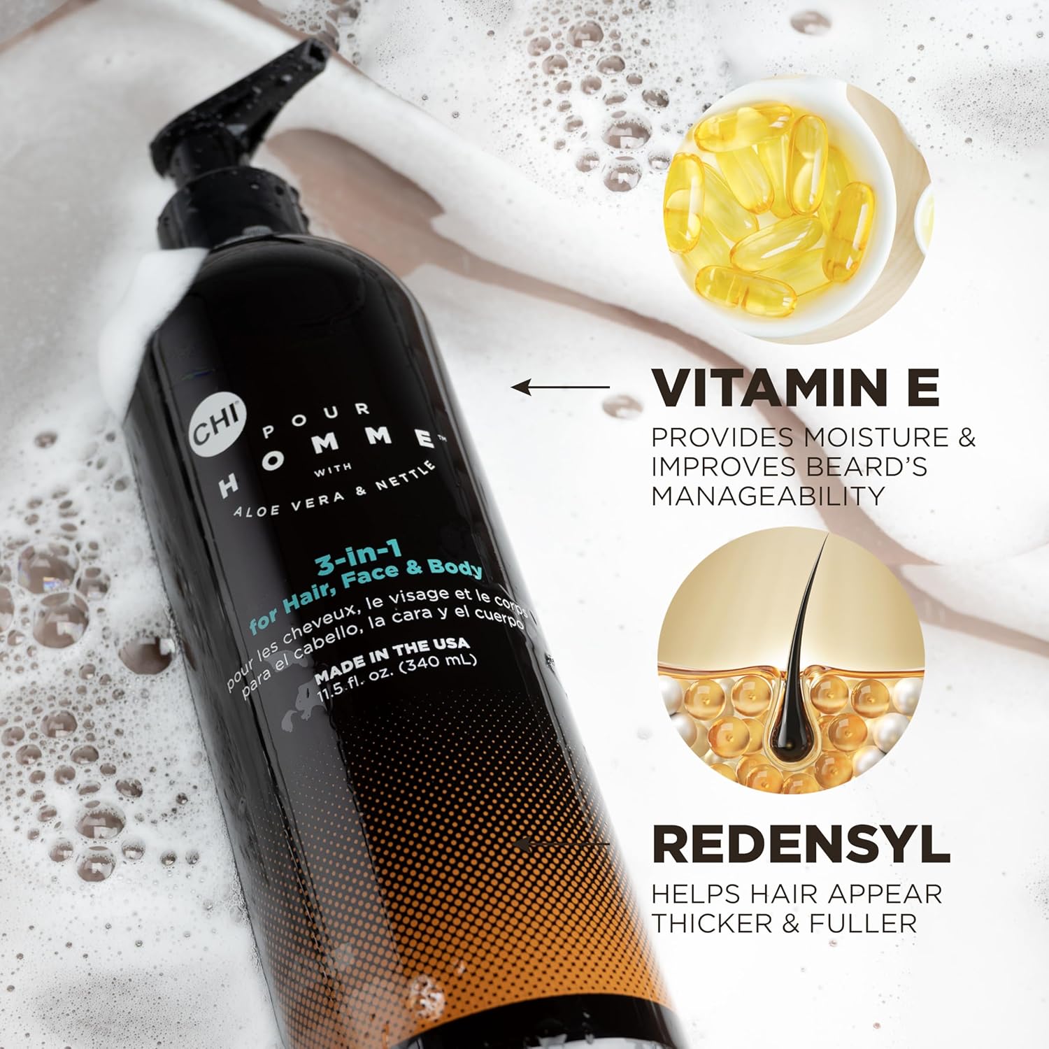 CHI Pour Homme 3-in-1 Cleansing & Moisturizing Hair, Face & Body Wash for Men, Made With Aloe Vera & Nettle, Fresh, Woody Scent, Sulfate-Free, 11.5 oz