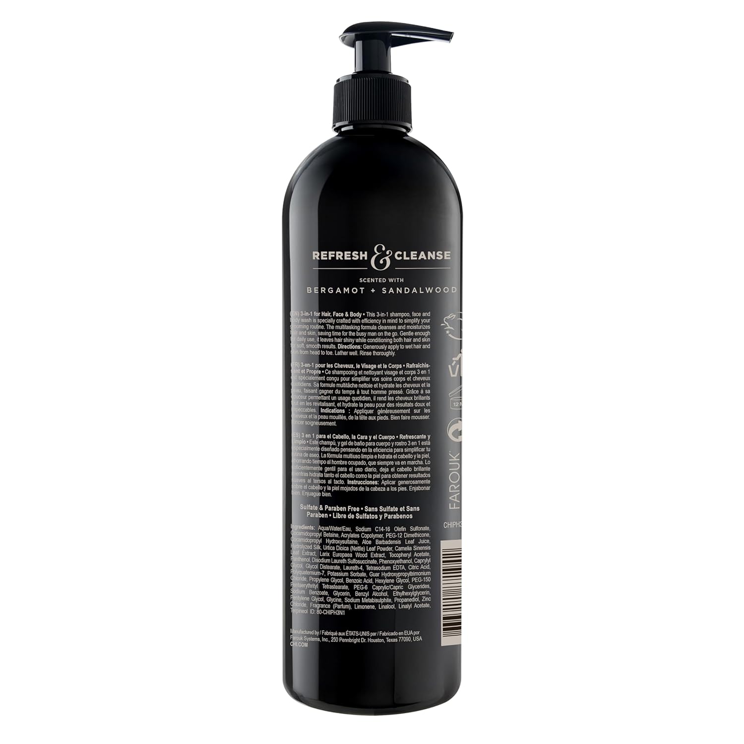 CHI Pour Homme 3-in-1 Cleansing & Moisturizing Hair, Face & Body Wash for Men, Made With Aloe Vera & Nettle, Fresh, Woody Scent, Sulfate-Free, 25 oz
