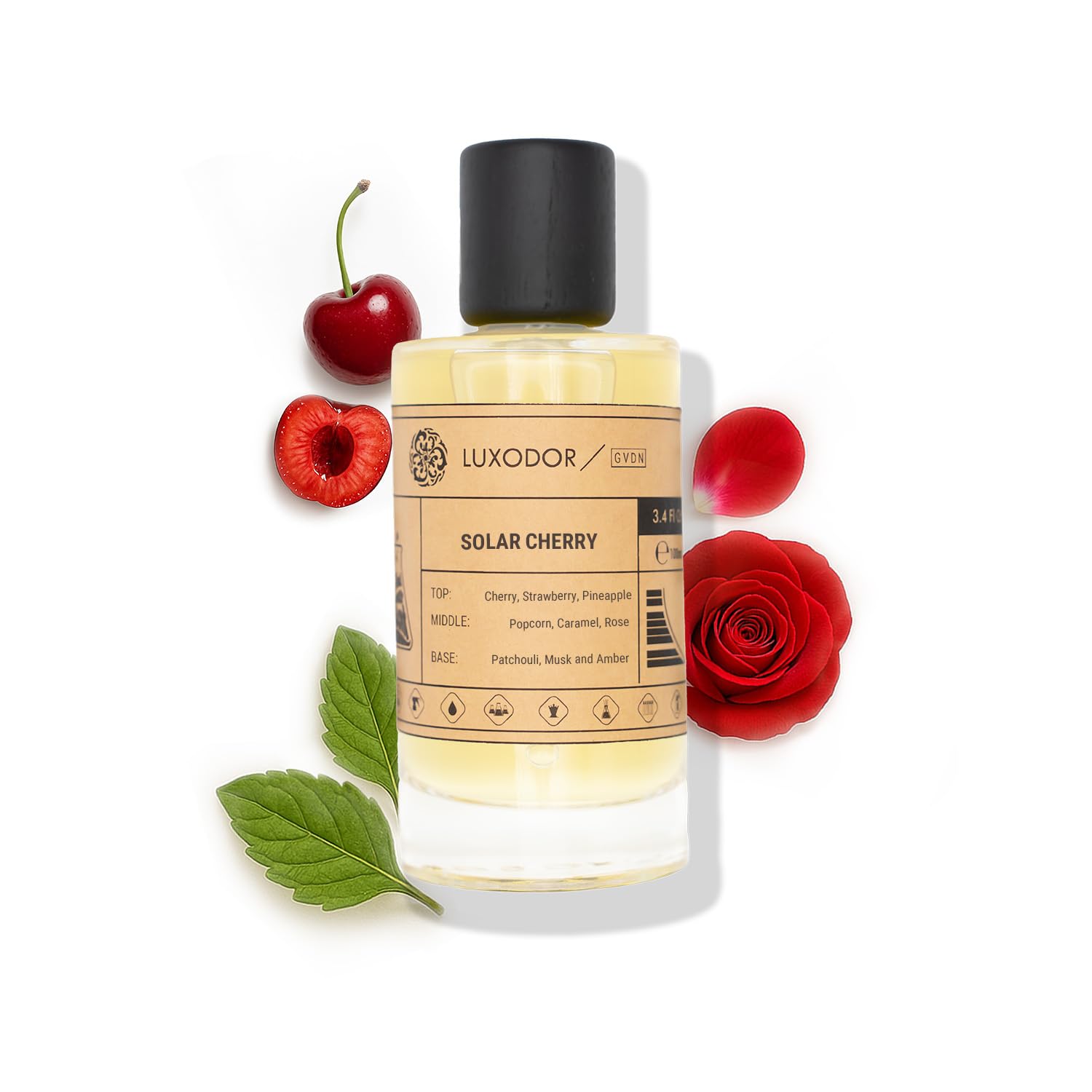 - Solar Cherry by LUXODOR is a playful perfumes for women scent with top notes of cherry, strawberry, pineapple, and mandarin orange; middle notes of popcorn, caramel, rose, jasmine, and violet; and a cozy perfume base of patchouli, musk, and amber