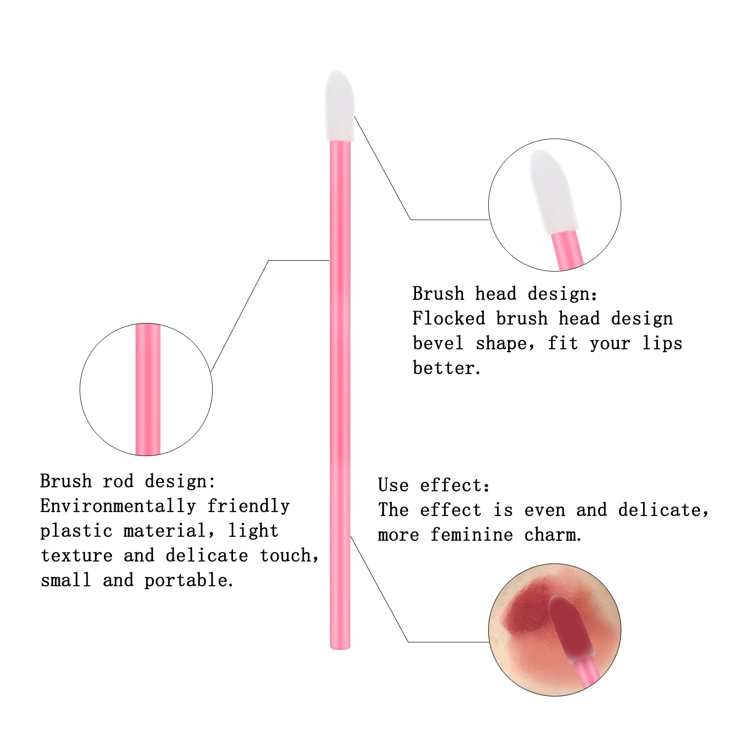 - Premium Flocking for flawless application Made with high-density flocking fibers, these brushes gently adhere to lips for even coverage of lipstick, gloss, and concealer. No streaking, no clumping—perfect for creating smooth gradients and precise edges.