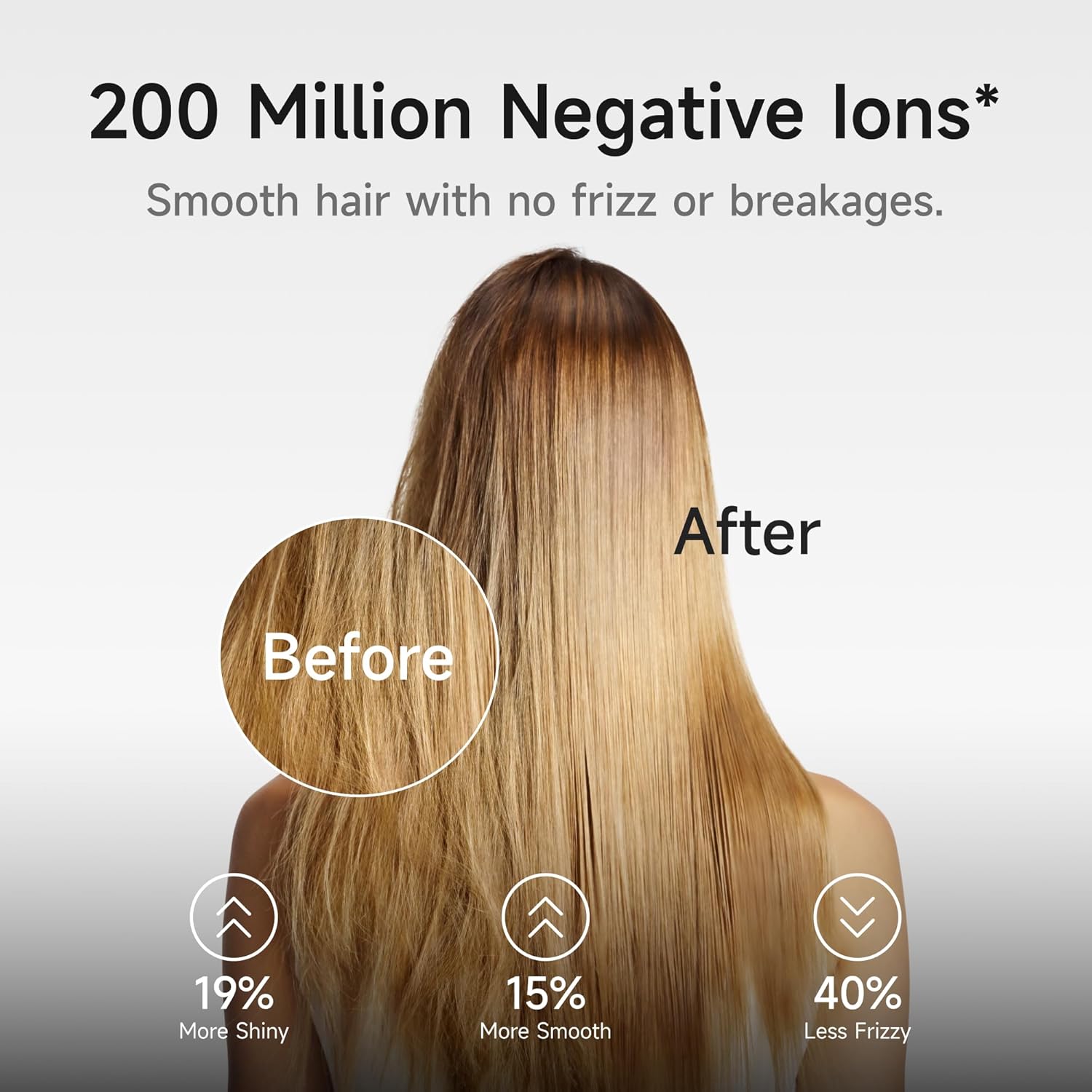 - [200M Negative Ions] Emits 200M negative ions while drying, fending off frizz and flyaways from the source. The ions also break down water molecules faster, reducing drying time and heat exposure.