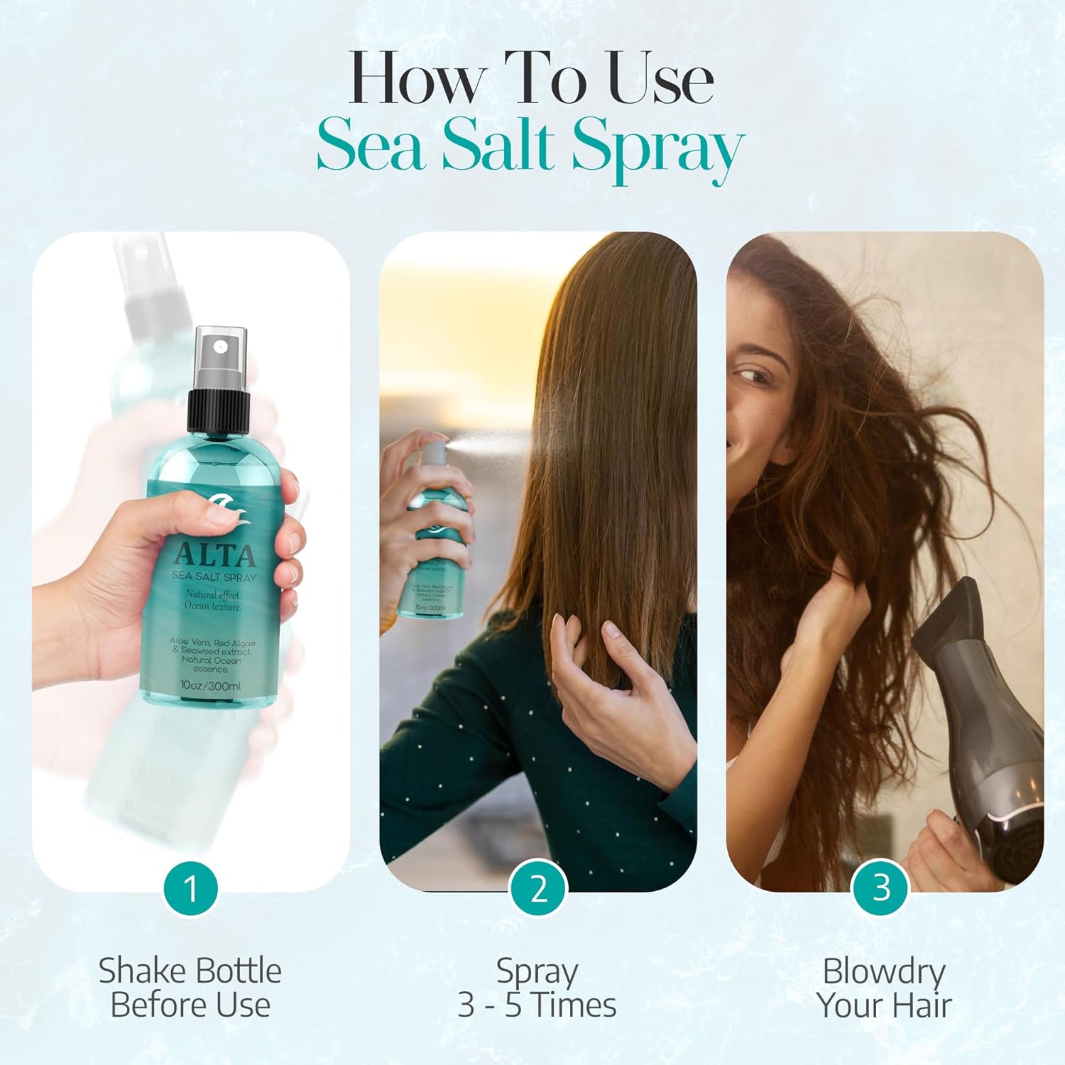 - ☑️ REFRESHING BEACH LOOK: ALTA Sea salt spray for hair women and men add effortless beachy texture, lifts flat hair, fresh ocean essence for all hair types. Effective way to achieve beautiful soft, tousled waves or messy without compromising hair health. Ideal for creating movement and Volume in just a few sprays. Creates a natural beach hair look with texture.