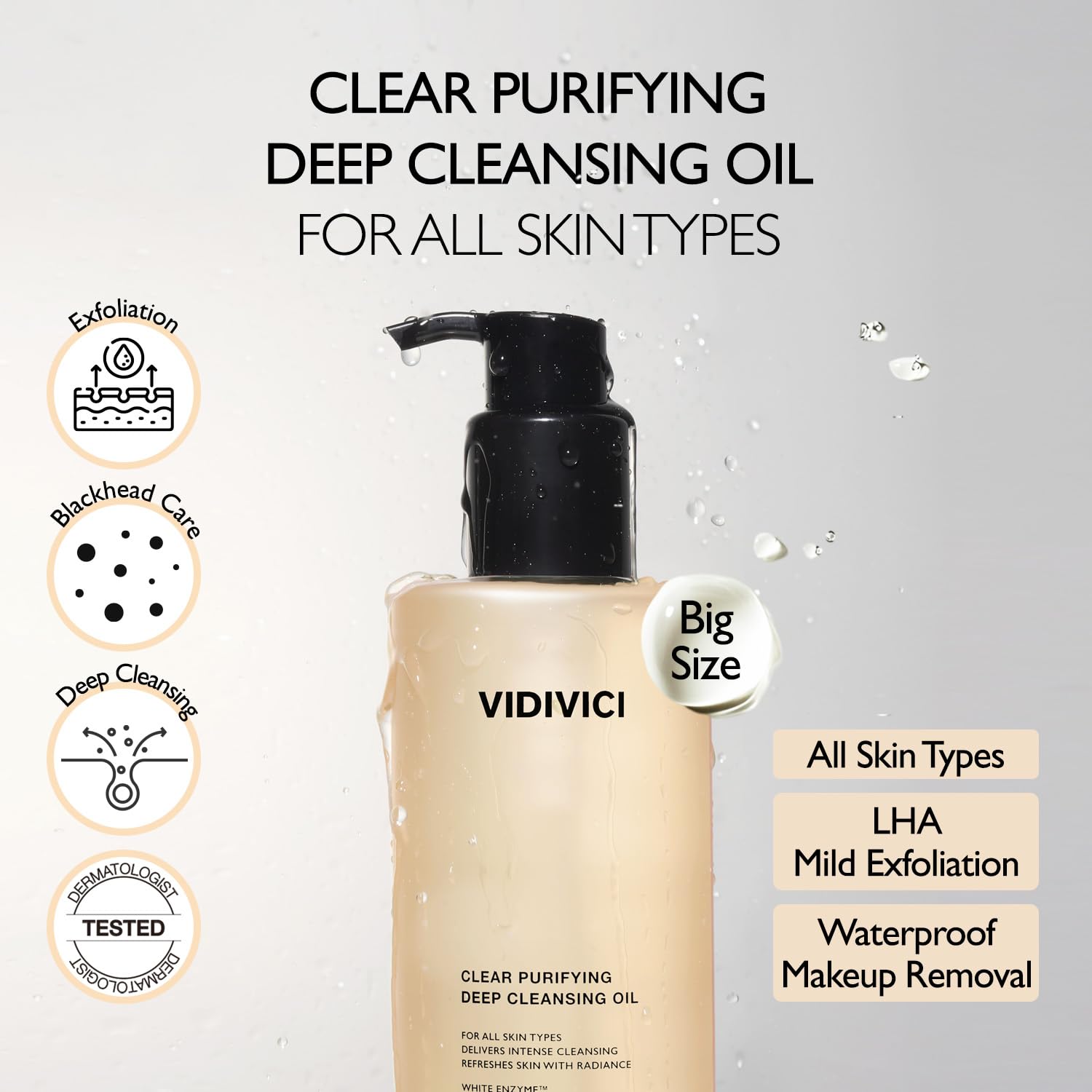 VIDIVICI Clear Purifying Deep Cleansing Oil 10.14 fl.oz | Gentle Makeup Remover for All Skin Types,Removes Waterproof Makeup with LHA,fermented camellia seed oil&rosehip seed oil,Korean skin care