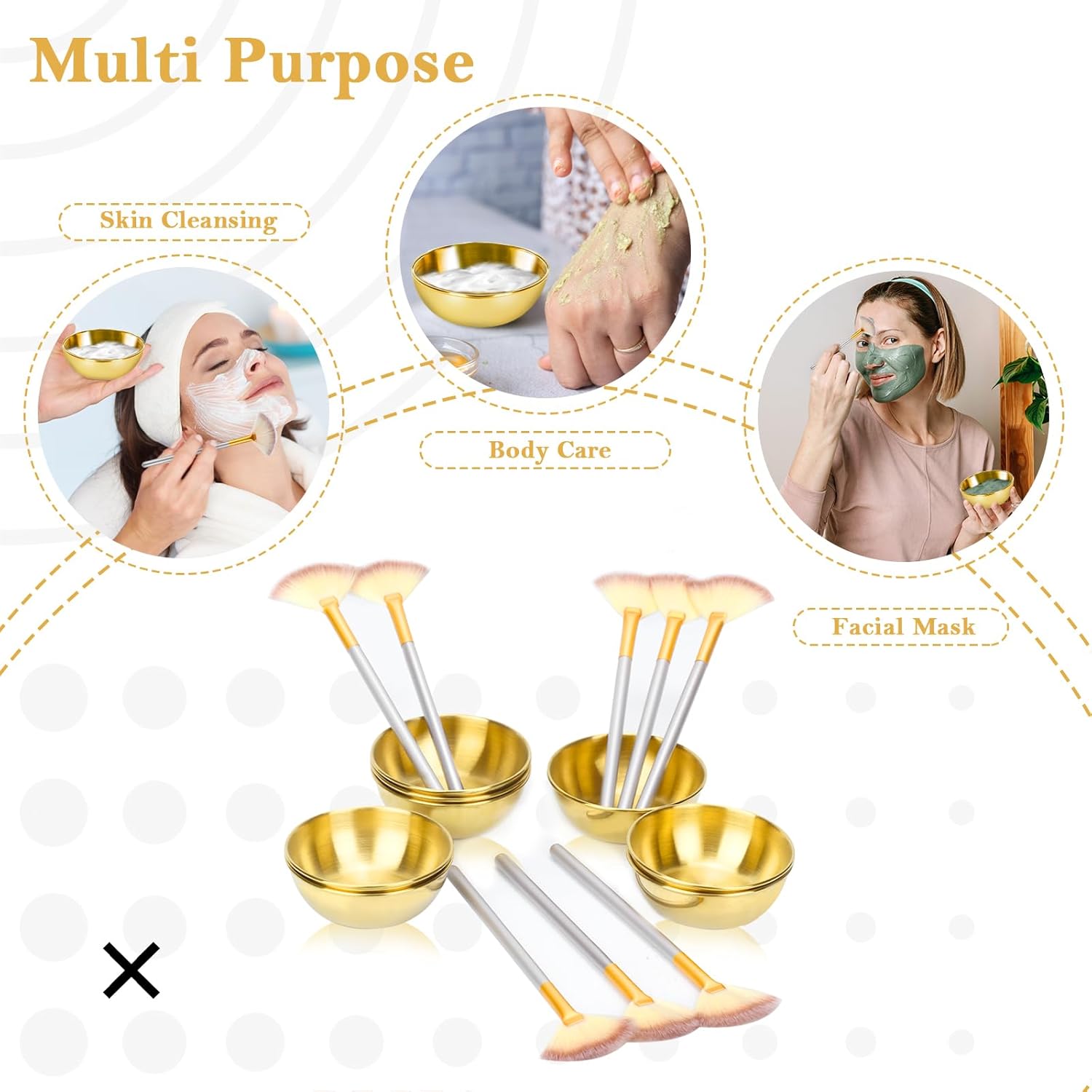 - 1. Exquisite appearance: 8-piece gold beauty tool set, 4 pcs 3.54x1.2 inch gold stainless steel mask bowls, durable and not easy to break, escort your skin care process; with 4 pcs 6x1.8 inch fan-shaped makeup brushes, suitable for stirring,applying masks and large-area makeup, the simple and atmospheric gold appearance adds a touch of elegance to your beauty ritual.