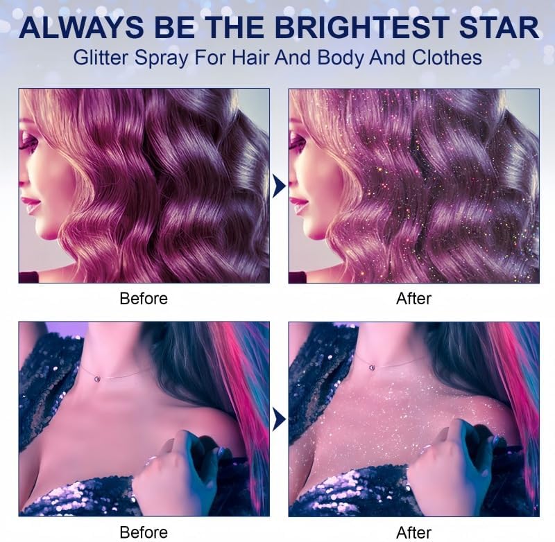 - Glitter spray is the perfect addition for body glitter adornment, ideal for festivals, clubs, parties, raves, outfits, adding glitter and charm to your face, body and hair.
