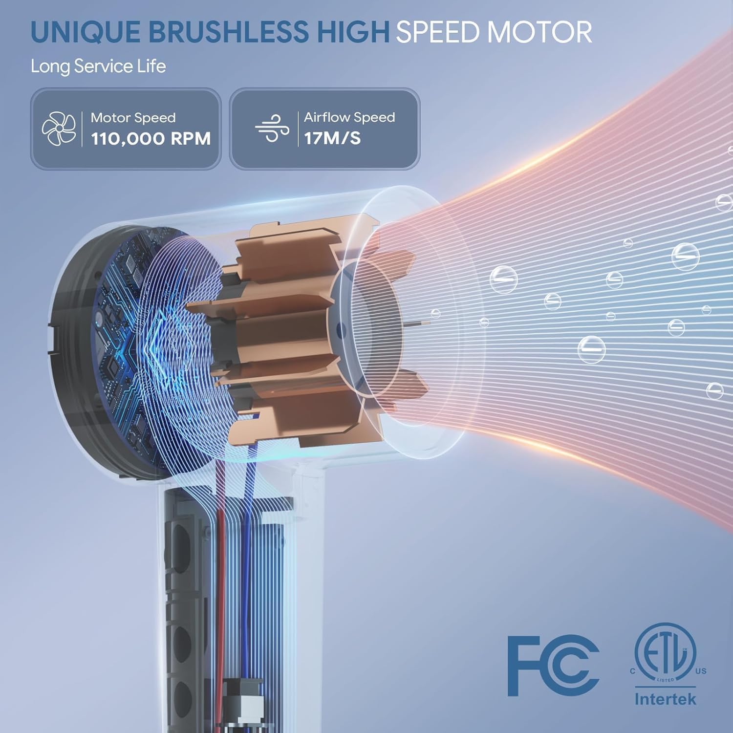 - High-Speed Motor for Fast Drying: Equipped with a powerful 110,000 RPM brushless motor and an enhanced duct design, the Labiim professional hair dryer delivers swift airflow at 17m/s—five times faster than traditional hairdryers.