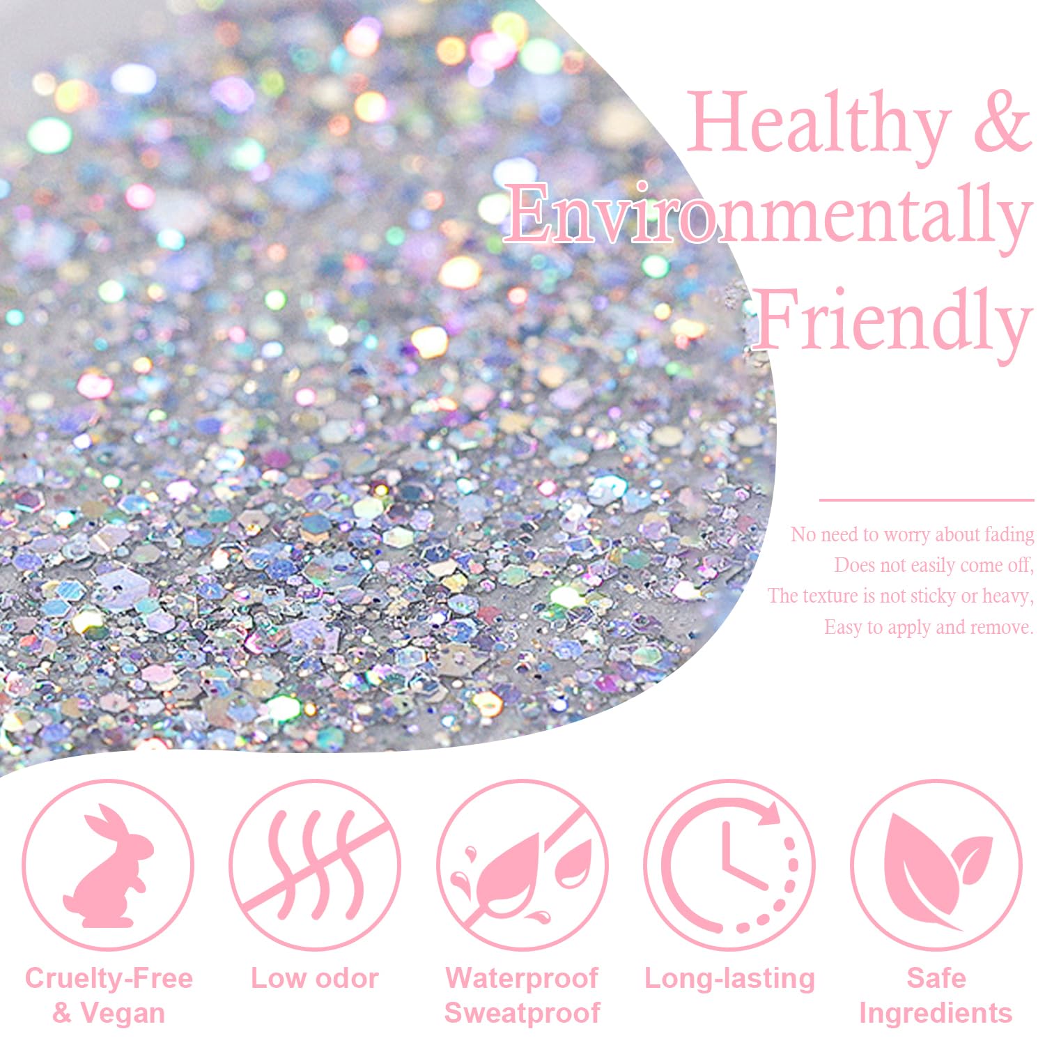 - 【High Quality】: Glitters are made with high intensity pigment and holographic shine- would not irritate your skin, is not easy to drop and fly powder; Quality assurance and our product is recyclable and very environmental protection. No Pollution, No Hurt.