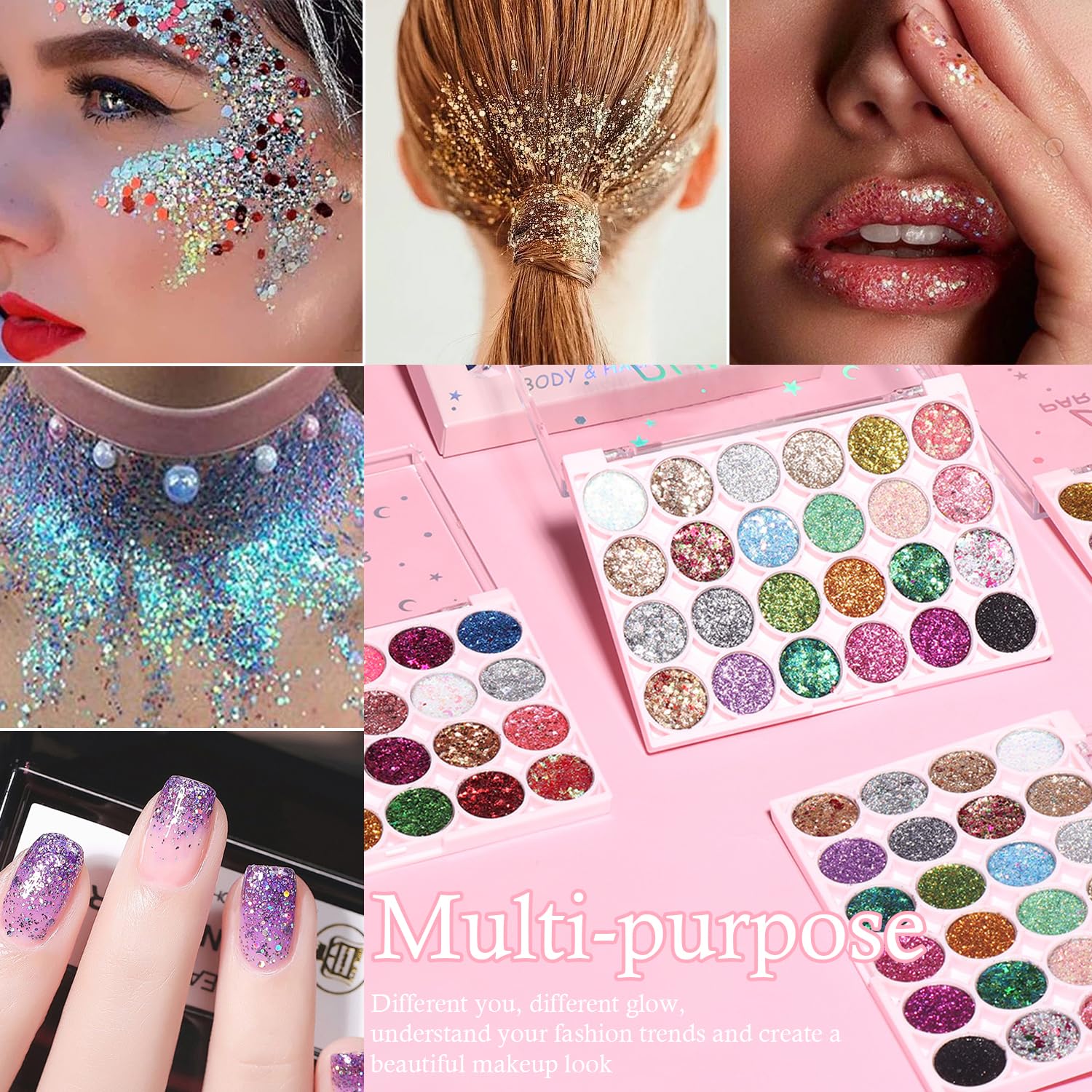 - 【Multi-Function Makeup Palette】This Palette make-up tool can be apply glitter primer or glitter glue, mainly suitable for eyes, lip, cheek , body, nails, and hair art. One palette meet all color makeup needs.