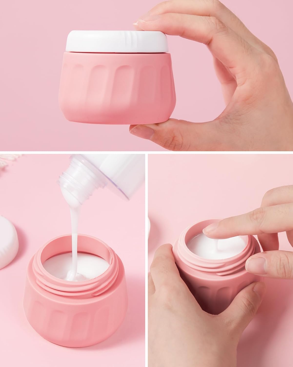 - Travel Size Toiletries: Set includes 4 silicone squeeze bottles 3oz(90ml) and 4 silicone cream jars 3oz(90ml) and clear make-up bag 6.46x2.87x5.31inch. Contents identification label sticker included